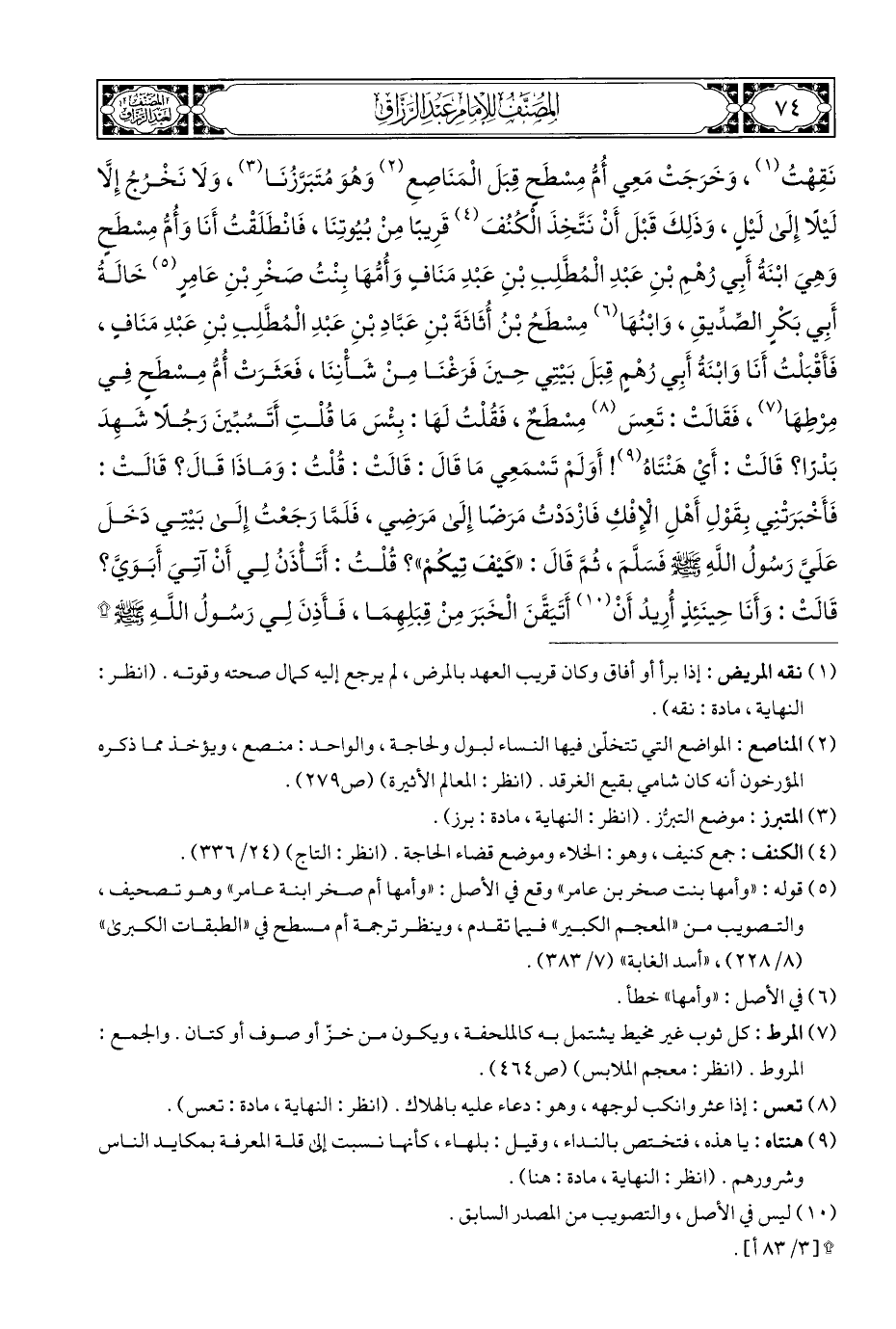 نَقِهْتُ (¬١)، وَخَرَجَتْ مَعِي أُمُّ مِسْطَحٍ قِبَلَ الْمَنَاصِعِ (¬٢) وَهُوَ مُتَبَرَّزُنَا (¬٣)، وَلَا نَخْرُجُ إِلَّا لَيْلًا إِلَى لَيْلٍ، وَذَلِكَ قَبْلَ أَنْ نَتَّخِذَ الْكُنُفَ (¬٤) قَرِيبًا مِنْ بُيُوتِنَا، فَانْطَلَقْتُ أَنَا وَأُمُّ مِسْطَحٍ وَهِيَ ابْنَةُ أَبِي رُهْمِ بْنِ عَبْدِ الْمُطَّلِبِ بْنِ عَبْدِ مَنَافٍ وَأُمُّهَا بِنْتُ صَخْرِ بْنِ عَامِرٍ (¬٥) خَالَةُ أَبِي بَكْرٍ الصِّدِّيقِ، وَابْنُهَا (¬٦) مِسْطَحُ بْنُ أُثَاثَةَ بْنِ عَبَّادِ بْنِ عَبْدِ الْمُطَّلِبِ بْنِ عَبْدِ مَنَافٍ، فَأَقْبَلْتُ أَنَا وَابْنَةُ أَبِي رُهْمٍ قِبَلَ بَيْتِي حِينَ فَرَغْنَا مِنْ شَأْنِنَا، فَعَثَرَتْ أُمُّ مِسْطَحٍ فِي مِرْطِهَا (¬٧)، فَقَالَتْ: تَعِسَ (¬٨) مِسْطَحٌ، فَقُلْتُ لَهَا: بِئْسَ مَا قُلْتِ أَتَسُبِّينَ رَجُلًا شَهِدَ بَدْرًا؟ قَالَتْ: أَيْ هَنْتَاهُ (¬٩)! أَوَلَمْ تَسْمَعِي مَا قَالَ: قَالَتْ: قُلْتُ: وَمَاذَا قَالَ؟ قَالَتْ: فَأَخْبَرَتْنِي بِقَوْلِ أَهْلِ الْإِفْكِ فَازْدَدْتُ مَرَضًا إِلَى مَرَضي، فَلَمَّا رَجَعْتُ إِلَى بَيْتِي دَخَلَ عَلَيَّ رَسُولُ اللَّهِ - صلى الله عليه وسلم - فَسَلَّمَ، ثُمَّ قَالَ: "كَيْفَ تِيكُمْ"؟ قُلْتُ: أَتَأْذَنُ لِي أَنْ آتِيَ أَبَوَيَّ؟ قَالَتْ: وَأَنَا حِينَئِذٍ أُرِيدُ أَنْ (¬١٠) أَتَيَقَّنَ الْخَبَرَ مِنْ قِبَلِهِمَا، فَأَذِنَ لِي رَسُولُ اللَّهِ - صلى الله عليه وسلم - *
