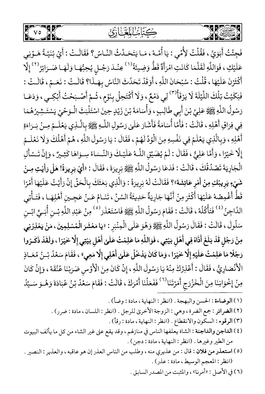 فَجِئْتُ أَبَوَيَّ، فَقُلْتُ لِأُمِّي: يَا أُمَّهْ، مَا يَتَحَدَّثُ النَّاسُ؟ فَقَالَتْ: أَيْ بُنَيَّةُ هَوِّنِي عَلَيْكِ، فَوَاللَّهِ لَقَلَّمَا كَانَتِ امْرَأَةٌ قَطُّ وَضِيئَةً (¬١) عِنْدَ رَجُلٍ يُحِبُّهَا وَلَهَا ضَرَائِرُ (¬٢) إِلَّا أَكْثَرْنَ عَلَيْهَا، قُلْتُ: سُبْحَانَ اللَّهِ، أَوَقَدْ تَحَدَّثَ النَّاسُ بِهَذَا؟ قَالَتْ: نَعَمْ، قَالَتْ: فَبَكَيْتُ تِلْكَ اللَّيْلَةَ لَا يَرْقَأُ (¬٣) لِي دَمْعٌ، وَلَا أكْتَحِلُ بِنَوْمٍ، ثُمَّ أَصْبَحْتُ أَبْكِي، وَدَعَا رَسُولُ اللَّهِ - صلى الله عليه وسلم - عَلِيَّ بْنَ أَبِي طَالِبٍ، وَأُسَامَةَ بْنَ زَيْدٍ حِينَ اسْتَلْبَثَ الْوَحْيُ يَسْتَشِيرُهُمَا فِي فِرَاقِ أَهْلِهِ، قَالَتْ: فَأَمَّا أُسَامَةُ فَأَشَارَ عَلَى رَسُولِ اللَّهِ - صلى الله عليه وسلم - بالَّذِي يَعْلَمُ مِنْ بَرَاءَةِ أَهْلِهِ، وَبِالَّذِي يَعْلَمُ فِي نَفْسِهِ مِنَ الْوُدِّ لَهُمْ، فَقَالَ: يَا رَسولَ اللَّهِ، هُمْ أَهْلُكَ وَلَا نَعْلَمُ إِلَّا خَيْرًا، وَأَمَّا عَلِيٌّ، فَقَالَ: لَمْ يُضَيِّقِ اللَّهُ عَلَيْكَ وَالنِّسَاءُ سوَاهَا كَثِيرٌ، وإِنْ تَسْأَلِ الْجَارِيَةَ تَصْدُقْكَ، قَالَتْ: فَدَعَا رَسُولُ اللَّهِ - صلى الله عليه وسلم - بَرِيرَةُ، فَقَالَ: "أَيْ بَرِيرَةُ! هَلْ رَأَيْتِ مِنْ شَيءٍ يَرِيبُكِ مِنْ أَمْرِ عَائِشَةَ"؟ فَقَالَتْ لَهُ بَرِيرَةُ: وَالَّذِي بَعَثَكَ بِالْحَقِّ إِنْ رَأَيْتُ عَلَيْهَا أَمْرًا قَطُّ أَغْمِصُهُ عَلَيْهَا أَكْثَرَ مِنْ أَنَّهَا جَارِيَةٌ حَدِيثَةُ السِّنِّ، تَنَامُ عَنْ عَجِينِ أَهْلِهَا، فَتَأْتي الدَّاجِنُ (¬٤) فَتَأْكُلُهُ، قَالَتْ: فَقَامَ رَسُولُ اللَّهِ - صلى الله عليه وسلم - فَاسْتَعْذَرَ (¬٥) مِنْ عَبْدِ اللَّهِ بْنِ أُبَيٍّ ابْنِ سَلُولَ، قَالَتْ: فَقَالَ رَسُولُ اللَّهِ - صلى الله عليه وسلم - وهُوَ عَلَى الْمِنْبَرِ: "يَا مَعْشَرَ الْمُسْلِمِينَ، مَنْ يَعْذِرُنِي مِنْ رَجُلٍ قَدْ بَلَغَ أَذَاهُ فِي أَهْلِ بَيْتِي، فَوَاللَّهِ مَا عَلِمْتُ عَلَى أَهْلِ بَيْتِي إِلَّا خَيرًا، وَلَقَدْ ذَكَرُوا رَجُلًا مَا عَلِمْتُ عَلَيْهِ إِلَّا خَيْرًا، وَمَا كَانَ يَدْخُلُ عَلَى أَهْلِي إِلَّا مَعِي"، فَقَامَ سَعْدُ بْنُ مُعَاذٍ الْأَنْصَارِيُّ، فَقَالَ: أَعْذِرُكَ مِنْهُ يَا رَسُولَ اللَّهِ، إِنْ كَانَ مِنَ الْأَوْسِ ضَرَبْنَا عُنُقَهُ، وإِنْ كَانَ مِنْ إِخْوَانِنَا مِنَ الْخَزْرَجِ أَمَرْتَنَا (¬٦) فَفَعَلْنَا أَمْرَكَ، قَالَتْ: فَقَامَ سَعْدُ بْنُ عُبَادَةَ وَهُوَ سَيِّدُ