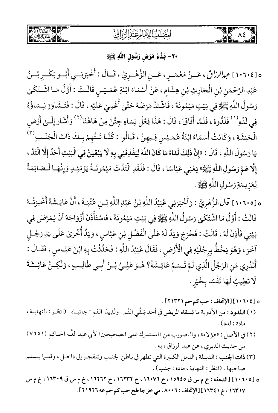 ° [١٠٦٠٤] عبد الرزاق، عَنْ مَعْمَرٍ، عَنِ الزُّهْرِيِّ، قَالَ: أَخْبَرَنِي أَبُو بَكْرِ بْنُ عَبْدِ الرَّحْمَنِ بْنِ الْحَارِثِ بْنِ هِشَامٍ، عَنْ أَسْمَاءَ ابْنَةِ عُمَيْسٍ قَالَتْ: أَوَّلُ مَا اشْتَكَى رَسُولُ اللَّهِ - صلى الله عليه وسلم - في بَيْتِ مَيْمُونَةَ، فَاشْتَدَّ مَرَضُهُ حَتَّى أُغْمِيَ عَلَيْهِ، قَالَ: فَتَشَاوَرَ نِسَاؤُهُ فِي لَدِّهِ (¬١) فَلَدُّوهُ، فَلَمَّا أَفَاقَ، قَالَ: هَذَا فِعْلُ نِسَاءٍ جِئْنَ مِنْ هَاهُنَا (¬٢) وَأَشَارَ إِلَى أَرْضِ الْحَبَشَةِ، وَكَانَتْ أَسْمَاءُ ابْنَةُ عُمَيْسٍ فِيهِنَّ، قَالُوا: كُنَّا نَتَّهِمُ بِكَ ذَاتَ الْجَنْبِ (¬٣) يَا رَسُولَ اللَّهِ، قَالَ: "إِنَّ ذَلِكَ لَدَاءٌ مَا كَانَ اللَّهُ لِيَقْذِفَنِي بِهِ لَا يَبْقَيَنَّ فِي الْبَيتِ أَحَدٌ إِلَّا الْتَدَّ، إِلَّا عَمُّ رَسُولِ اللَّهِ - صلى الله عليه وسلم - " يَعْنِي عَبَّاسًا، قَالَ: فَلَقَدِ الْتَدَّتْ مَيْمُونَةُ يَوْمَئِذٍ وإنَّهَا لَصائِمَةٌ لِعَزِيمَةِ رَسُولِ اللَّهِ - صلى الله عليه وسلم -.