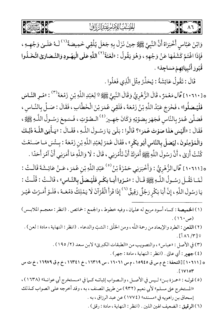 ° [١٠٦١٠] قال مَعْمَرٌ، قَالَ الزُّهْرِيُّ وَقَالَ النَّبِيُّ * - صلى الله عليه وسلم - لِعَبْدِ اللَّهِ بْنِ زَمْعَةَ (¬٣): "مُرِ النَّاسَ فَليُصَلُّوا"، فَخَرَجَ عَبْدُ اللَّهِ بْنُ زَمْعَةَ، فَلَقِيَ عُمَرَ بْنَ الْخَطَّابِ، فَقَالَ: صَلِّ بِالنَّاسِ، فَصَلَّى عُمَرُ بِالنَّاسِ فَجَهَرَ بِصَوْتِهِ وَكَانَ جَهِيرَ (¬٤) الصَّوْتِ، فَسَمِعَ رَسُولُ اللَّهِ - صلى الله عليه وسلم -، فَقَالَ: "أَلَيْسَ هَذَا صَوْتَ عُمَرَ"؟ قَالُوا: بَلَى يَا رَسُولَ اللهِ، فَقَالَ: "يَأْبَى اللَّهُ ذَلِكَ وَالْمُؤْمِنُونَ، لِيُصَلِّ بِالنَّاسِ أَبُو بَكْرٍ"، فَقَالَ عُمَرُ لِعَبْدِ اللهِ بْنِ زَمْعَةَ: بِئْسَ مَا صَنَعْتَ كُنْتُ أَرَى، أَنَّ رَسُولَ اللَّهِ - صلى الله عليه وسلم - أَمَرَكَ أَنْ تَأْمُرَنِي، قَالَ: لَا وَاللَّهِ مَا أَمَرَنِي أَنْ آمُرَ أَحَدًا.