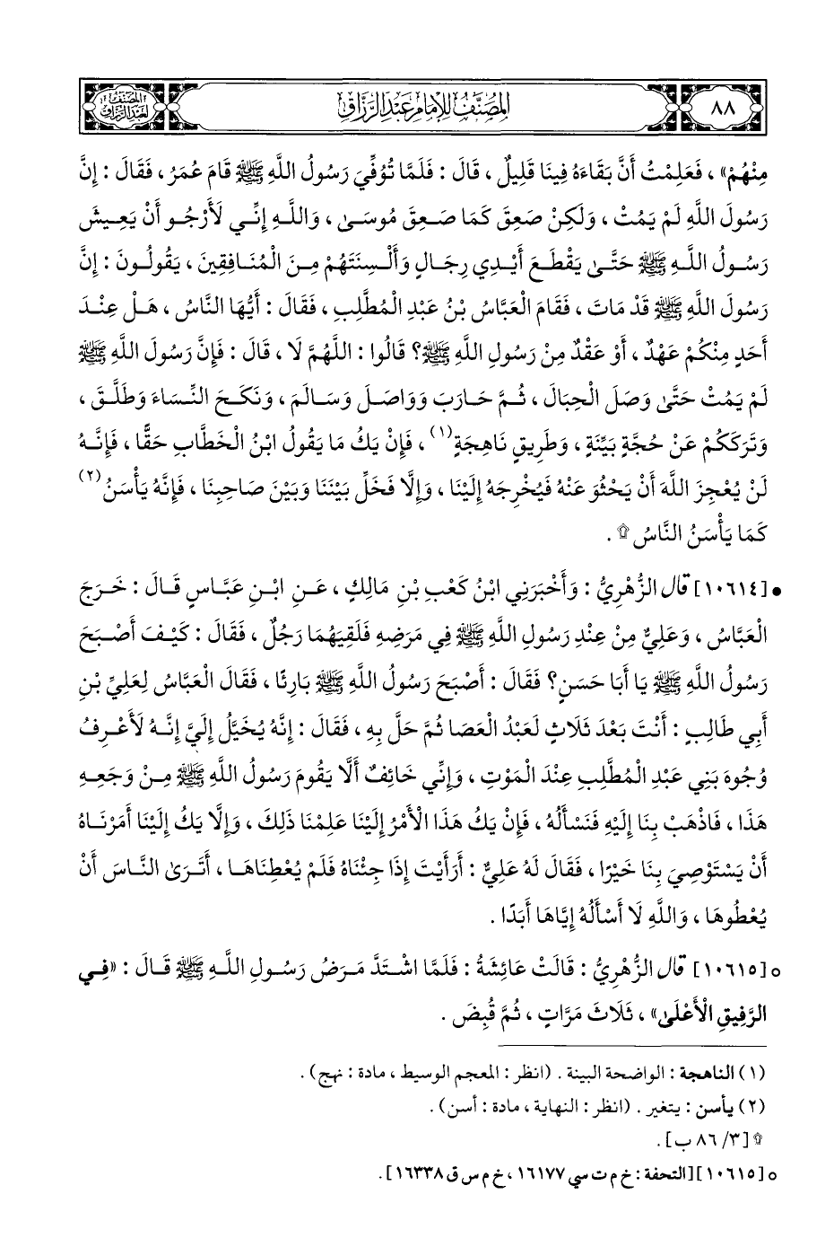 ° [١٠٦١٥] قال الزُّهْرِيُّ: قَالَتْ عَائِشَةُ: فَلَمَّا اشْتَدَّ مَرَضُ رَسُولِ اللَّهِ - صلى الله عليه وسلم - قَالَ: "فِي الرَّفِيقِ الْأَعْلَى"، ثَلَاثَ مَرَّاتٍ، ثُمَّ قُبِضَ.