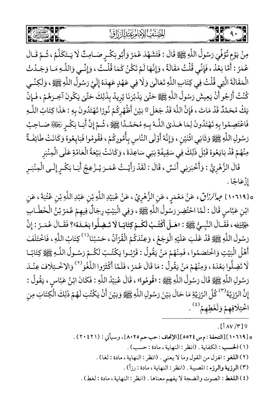 ° [١٠٦١٩] عبد الرزاق، عَنْ مَعْمَرٍ، عَنِ الزُّهْرِيِّ، عَنْ عُبَيْدِ اللَّهِ بْنِ عَبْدِ اللَهِ بْنِ عُتْبَةَ، عَنِ ابْنِ عَبَّاسٍ قَالَ: لَمَّا احْتُضِرَ رَسُولُ اللَّهِ - صلى الله عليه وسلم -، وَفِي الْبَيْتِ رِجَالٌ فِيهِمْ عُمَرُ بْنُ الْخَطَّابِ - رضي الله عنه -، فَقَالَ النَّبِيُّ - صلى الله عليه وسلم -: "هَل أَكتُبُ لَكُمْ كِتَابًا لَا تَضِلُّوا بَعْدَهُ"؟ فَقَالَ عُمَرُ: إِنَّ رَسُولَ اللَّهِ - صلى الله عليه وسلم - قَدْ غَلَبَ عَلَيْهِ الْوَجَع، وَعِنْدَكُمُ الْقُرْآن، حَسْبُنَا (¬١) كِتَابُ اللَّهِ، فَاخْتَلَفَ أَهْلُ الْبَيْتِ وَاخْتَصَمُوا، فَمِنْهُمْ مَنْ يَقُولُ: قَرِّبُوا يَكْتُبْ لكُمْ رَسُولُ اللهِ - صلى الله عليه وسلم - كِتَابًا لَا تَضِلُّوا بَعْدَهُ، وَمِنْهُمْ مَنْ يَقُولُ: مَا قَالَ عُمَر، فَلَمَّا أَكْثَرُوا اللَّغْوَ (¬٢) وَالاِخْتِلَافَ عِنْدَ رَسُولِ اللَّهِ - صلى الله عليه وسلم - قَالَ رَسُولُ اللَّهِ - صلى الله عليه وسلم -: "قُومُوا"، قَالَ عُبَيْدُ اللَّهِ: فَكَانَ ابْنُ عَبَّاسٍ، يَقُولُ: إِنَّ الرِّزِيَّةَ (¬٣) كُلَّ الرَّزِيَّةِ مَا حَالَ بَيْنَ رَسُولِ اللَّهِ - صلى الله عليه وسلم - وَبَيْنَ أَنْ يَكْتُبَ لَهُمْ ذَلِكَ الْكِتَابَ مِنِ اخْتِلَافِهِمْ وَلَغَطِهِمْ (¬٤).