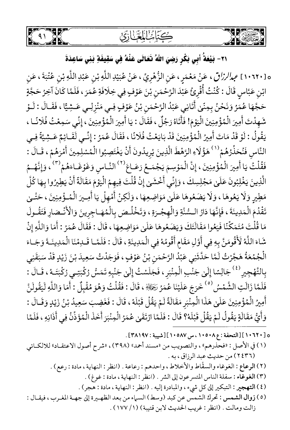 ° [١٠٦٢٠] عبد الرزاق، عَنْ مَعْمَرٍ، عَنِ الزُّهْرِيِّ، عَنْ عُبَيْدِ اللهِ بْنِ عَبْدِ اللَّهِ بْنِ عُتْبَةَ، عَنِ ابْنِ عَبَّاسٍ قَالَ: كُنْتُ أُقْرِئُ عَبْدَ الرَّحْمَنِ بْنَ عَوْفٍ فِي خِلَافَةِ عُمَرَ، فَلَمَّا كَانَ آخِرُ حَجَّةٍ حَجَّهَا عُمَرُ وَنَحْنُ بِمِنًى أَتَانِي عَبْدُ الرَّحْمَنِ بْنُ عَوْفٍ فِي مَنْزِلِي عَشِيًّا، فَقَالَ: لَوْ شَهِدْتَ أَمِيرَ الْمُؤْمِنِينَ الْيَوْمَ! فَأَتَاهُ رَجُلٌ، فَقَالَ: يَا أَمِيرَ الْمُؤْمِنِينَ، إِنِّي سَمِعْتُ فُلَانًا، يَقُولُ: لَوْ قَدْ مَاتَ أَمِيرُ الْمُؤْمِنِينَ قَدْ بَايَعْتُ فُلَانًا، فَقَالَ عُمَرُ: إِنِّي لَقَائِمٌ عَشِيَّةً فِي النَّاسِ فَنُحَذِّرُهُمْ (¬١) هَؤُلَاءِ الرَّهْطَ الَّذِينَ يُرِيدُونَ أَنْ يَغْتَصِبُوا الْمُسْلِمِينَ أَمْرَهُمْ، قَالَ: فَقُلْتُ يَا أَمِيرَ الْمُؤْمِنِينَ، إِنَّ الْمَوْسِمَ يَجْمَعُ رَعَاعَ (¬٢) النَّاسِ وَغَوْغَاءَهُمْ (¬٣)، وَإِنَّهُمُ الَّذِينَ يَغْلِبُونَ عَلَى مَجْلِسِكَ، وإِنِّي أَخْشَى إِنْ قُلْتَ فِيهِمُ الْيَوْمَ مَقَالَةً أَنْ يَطِيرُوا بِهَا كُلَّ مَطِيرٍ وَلَا يَعُوهَا، وَلَا يَضعُوهَا عَلَى مَوَاضِعِهَا، وَلَكِنْ أَمْهِلْ يَا أَمِيرَ الْمُؤْمِنِينَ، حَتَّى تَقْدُمَ الْمَدِينَةَ، فَإِنَّهَا دَارُ السُّنَّةِ وَالْهِجْرَةِ، وَتَخْلُصَ بِالْمُهَاجِرِينَ وَالْأَنْصارِ فَتَقُولَ مَا قُلْتَ مُتَمَكِّنًا فَيَعُوا مَقَالَتَكَ وَيَضعُوهَا عَلَى مَوَاضِعِهَا، قَالَ: فَقَالَ عُمَرُ: أَمَا وَاللَّهِ إِنْ شاءَ اللَّهُ لأَقُومَنَّ بِهِ فِي أَوَّلِ مَقَامٍ أَقُومُهُ فِي الْمَدِينَةِ، قَالَ: فَلَمَّا قَدِمْنَا الْمَدِينَةَ وَجَاءَ الْجُمُعَةُ هَجَّرْتُ لَمَّا حَدَّثَنِي عَبْدُ الرَّحْمَنِ بْنُ عَوْفٍ، فَوَجَدْتُ سَعِيدَ بْنَ زَيْدٍ قَدْ سَبَقَنِي بِالتَّهْجِيرِ (¬٤) جَالِسًا إِلَى جَنْبِ الْمِنْبَرِ، فَجَلَسْتُ إِلَى جَنْبِهِ تَمَسُّ رُكْبَتِي رُكْبَتَه، قَالَ: فَلَمَّا زَالَتِ الشَّمْسُ (¬٥) خَرَجَ عَلَيْنَا عُمَرُ رَحِمَهُ الله، قَالَ: فَقُلْتُ وَهُوَ مُقْبِلٌ: أَمَا وَاللَّهِ لَيقُولَنَّ أَمِيرُ الْمُؤْمِنِينَ عَلَى هَذَا الْمِنْبَرِ مَقَالَةً لَمْ يَقُلْ قَبْلَه، قَالَ: فَغَضِبَ سَعِيدُ بْنُ زَيْدٍ وَقَالَ: وَأَيُّ مَقَالَةٍ يَقُولُ لَمْ يَقُلْ قَبْلَهُ؟ قَالَ: فَلَمَّا ارْتَقَى عُمَرُ الْمِنْبَرَ أَخَذَ الْمُؤَذِّنُ فِي أَذَانِهِ، فَلَمَّا