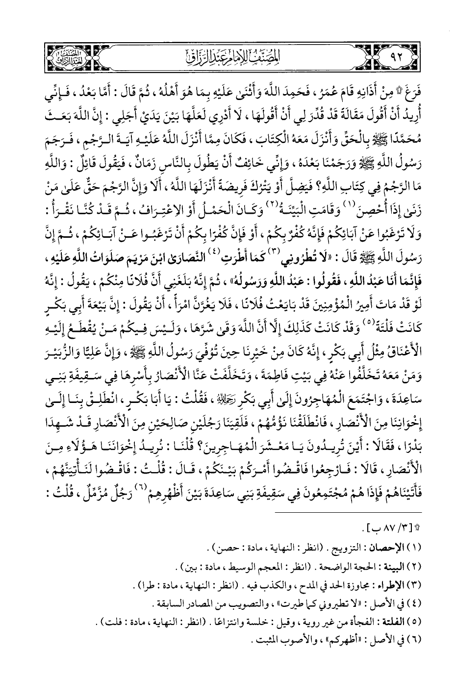 فَرَغَ * مِنْ أَذَانِهِ قَامَ عُمَر، فَحَمِدَ اللَّهَ وَأَثْنَى عَلَيْهِ بِمَا هُوَ أَهْلُه، ثُمَّ قَالَ: أَمَّا بَعْد، فَإِنِّي أُرِيدُ أَنْ أَقُولَ مَقَالَةً قَدْ قُدِّرَ لِي أَنْ أَقُولَهَا، لَا أَدْرِي لَعَلَّهَا بَيْنَ يَدَيْ أَجَلِي: إِنَّ اللَّهَ بَعَثَ مُحَمَّدًا - صلى الله عليه وسلم - بالْحَقِّ وَأَنْزَلَ مَعَهُ الْكِتَابَ، فَكَانَ مِمَّا أَنْزَلَ اللَّهُ عَلَيْهِ آيَةَ الرَّجْمِ، فَرَجَمَ رَسُولُ اللَّهِ - صلى الله عليه وسلم - ورَجَمْنَا بَعْدَه، وإِنِّي خَائِفٌ أَنْ يَطُولَ بِالنَّاسِ زَمَانٌ، فَيَقُولَ قَائِلٌ: وَاللهِ مَا الرَّجْمُ فِي كِتَابِ اللَّهِ؟ فَيضِلَّ أَوْ يَتْرُكَ فَرِيضَةً أَنْزَلَهَا اللَّه، أَلَا وإِنَّ الرَّجْمَ حَقٌّ عَلَى مَنْ زَنَى إِذَا أُحْصِنَ (¬١) وَقَامَتِ الْبَيِّنَةُ (¬٢) وَكَانَ الْحَمْلُ أَوْ الاِعْتِرَاف، ثُمَّ قَدْ كُنَّا نَقْرَأُ: وَلَا تَرْغَبُوا عَنْ آبَائِكُمْ فَإِنَّهُ كُفْرٌ بِكُمْ، أَوْ فَإِنَّ كُفْرًا بِكُمْ أَنْ تَرْغَبُوا عَنْ آبَائِكُمْ، ثُمَّ إِنَّ رَسُولَ اللَّهِ - صلى الله عليه وسلم - قَالَ: "لَا تُطْرُونِي (¬٣) كَمَا أَطْرَتِ (¬٤) النَّصَارَى ابْنَ مَرْيَمَ صَلَوَاتُ اللَّهِ عَلَيهِ، فَإِنَّمَا أَنَا عَبْدُ اللَّهِ، فَقُولُوا: عَبْدُ اللَّهِ وَرَسُولُهُ"، ثُمَّ إِنَّهُ بَلَغَنِي أَنَّ فُلَانًا مِنْكُمْ، يَقُولُ: إِنَّهُ لَوْ قَدْ مَاتَ أَمِيرُ الْمُؤْمِنِينَ قَدْ بَايَعْتُ فُلَانًا، فَلَا يَغُرَّنَّ امْرَأً، أَنْ يَقُولَ: إِنَّ بَيْعَةَ أَبِي بَكْرٍ كَانَتْ فَلْتَةً (¬٥) وَقَدْ كَانَتْ كَذَلِكَ إِلَّا أَنَّ اللَّهَ وَقَى شَرَّهَا، وَلَيْسَ فِيكُمْ مَنْ يُقْطَعُ إِلَيْهِ الْأَعْنَاقُ مِثْلُ أَبِي بَكْرٍ، إِنَّهُ كَانَ مِنْ خَيْرِنَا حِينَ تُوُفِّيَ رَسُولُ اللَّهِ - صلى الله عليه وسلم -، وإِنَّ عَلِيًّا وَالزُّبَيْرَ وَمَنْ مَعَهُ تَخَلَّفُوا عَنْهُ فِي بَيْتِ فَاطِمَةَ، وَتَخَلَّفَتْ عَنَّا الْأَنْصَارُ بِأَسْرِهَا فِي سَقِيفَةِ بَنِي سَاعِدَةَ، وَاجْتَمَعَ الْمُهَاجِرُونَ إِلَى أَبِي بَكْرٍ رَحِمَهُ الله، فَقُلْتُ: يَا أَبَا بَكْرٍ، انْطَلِقْ بِنَا إِلَى إِخْوَانِنَا مِنَ الْأَنْصَارِ، فَانْطَلَقْنَا نَؤُمُّهُمْ، فَلَقِيَنَا رَجُلَيْنِ صَالِحَيْنِ مِنَ الْأَنْصارِ قَدْ شَهِدَا بَدْرًا، فَقَالَا: أَيْنَ تُرِيدُونَ يَا مَعْشَرَ الْمُهَاجِرِينَ؟ قُلْنَا: نُرِيدُ إِخْوَانَنَا هَؤُلَاءِ مِنَ الْأَنْصارِ، قَالَا: فَارْجِعُوا فَاقْضُوا أَمْرَكُمْ بَيْنَكُمْ، قَالَ: قُلْتُ: فَاقْضُوا لَنَأْتِيَنَّهُمْ، فَأَتَيْنَاهُمْ فَإِذَا هُمْ مُجْتَمِعُونَ فِي سَقِيفَةِ بَنِي سَاعَدَةَ بَيْنَ أَظْهُرِهِمْ (¬٦) رَجُلٌ مُزَّمِّلٌ، قُلْتُ: