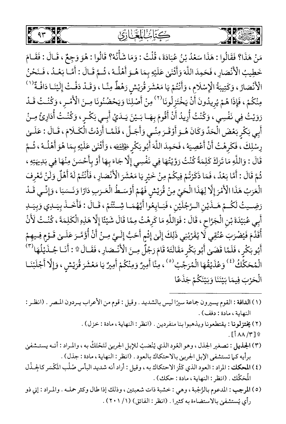 مَنْ هَذَا؟ فَقَالُوا: هَذَا سَعْدُ بْنُ عُبَادَةَ، قُلْتُ: وَمَا شَأْنُهُ؟ قَالُوا: هُوَ وَجِعٌ، قَالَ: فَقَامَ خَطِيبُ الْأَنْصَارِ، فَحَمِدَ اللَّهَ وَأَثْنَى عَلَيْهِ بِمَا هُوَ أَهْلُه، ثُمَّ قَالَ: أَمَّا بَعْد، فَنَحْنُ الْأَنْصَار، وَكَتِيبَةُ الْإِسْلَامِ، وَأَنْتُمْ يَا مَعْشَرَ قُرَيْشٍ رَهْطٌ مِنَّا، وَقَدْ دَفَّتْ إِلَيْنَا دَافَّةٌ (¬١) مِنْكُمْ، فَإِذَا هُمْ يُرِيدُونَ أَنْ يَخْتَزِلُونَا (¬٢) مِنْ أَصْلِنَا وَيَحْضُنُونَا مِنَ الْأَمْرِ، وَكُنْتُ قَدْ رَوَيْتُ فِي نَفْسِي، وَكُنْتُ أُرِيدُ أَنْ أَقُومَ بِهَا بَيْنَ يَدَيْ أَبِي بَكْرٍ، وَكُنْتُ أُدَارِئُ مِنْ أَبِي بَكْرٍ بَعْضَ الْحَدِّ وَكَانَ هُوَ أَوْقَرَ مِنِّي وَأَجَلَّ، فَلَمَّا أَرَدْتُ الْكَلَامَ، قَالَ: عَلَى رِسْلِكَ، فَكَرِهْتُ أَنْ أَعْصِيَه، فَحَمِدَ اللَّهَ أَبُو بَكْرٍ - رضي الله عنه -، وَأَثْنَى عَلَيْهِ بِمَا هُوَ أَهْلُه، ثُمَّ قَالَ: وَاللَّهِ مَا تَرَكَ كَلِمَةً كُنْتُ رَوَّيْتُهَا فِي نَفْسِي إِلَّا جَاءَ بِهَا أَوْ بِأَحْسَنَ مِنْهَا فِي بَدِيهَتِهِ، ثُمَّ قَالَ: أَمَّا بَعْد، فَمَا ذَكَرْتُمْ فِيكُمْ مِنْ خَيْرٍ يَا مَعْشَرَ الْأَنْصَارِ، فَأَنْتُمْ لَهُ أَهْلٌ وَلَنْ تَعْرِفَ الْعَرَبُ هَذَا الْأَمْرَ إِلَّا لِهَذَا الْحَيِّ مِنْ قُرَيْشٍ فَهُمْ أَوْسَطُ الْعَرَبِ دَارًا وَنَسَبًا، وإِنِّي قَدْ رَضِيتُ لكمْ هَذَيْنِ الرَّجُلَيْنِ، فَبَايِعُوا أَيَّهُمَا شِئْتُمْ، قَالَ: فَأَخَذَ بِيَدِي وَبِيَدِ أَبِي عُبَيْدَةَ بْنِ الْجَرَّاحِ، قَالَ: فَوَاللَّهِ مَا كَرِهْتُ مِمَّا قَالَ شَيْئًا إِلَّا هَذِهِ الْكَلِمَةَ، كُنْتُ لأَنْ أُقَدَّمَ فَيُضْرَبَ عُنُقِي لَا يُقَرِّبُنِي ذَلِكَ إِلَى إِثْمٍ أَحَبُّ إِلَيَّ مِنْ أَنْ أُؤَمَّرَ عَلَى قَوْمٍ فِيهِمْ أَبُو بَكْرٍ، فَلَمَّا قَضَى أَبُو بَكْرٍ مَقَالَتَهُ قَامَ رَجُلٌ مِنَ الْأَنْصَارِ، فَقَالَ *: أَنَا جُذَيْلُهَا (¬٣) الْمُحَكَّكُ (¬٤) وَعُذَيْقُهَا الْمُرَجَّبُ (¬٥)، مِنَّا أَمِيرٌ وَمِنْكُمْ أَمِيرٌ يَا مَعْشَرَ قُرَيْشٍ، وإِلَّا أَجْلَبْنَا الْحَرْبَ فِيمَا بَيْنَنَا وَبَيْنَكُمْ جَذَعًا