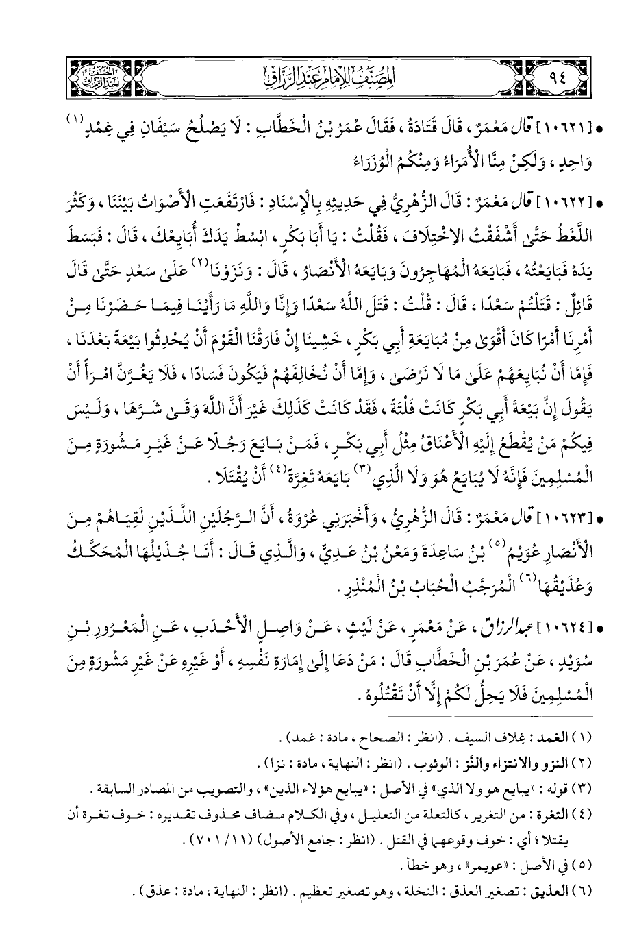 • [١٠٦٢١] قال مَعْمَرٌ، قَالَ قَتَادَة، فَقَالَ عُمَرُ بْنُ الْخَطَّابِ: لَا يَصْلُحُ سَيْفَانِ فِي غِمْدٍ (¬١) وَاحِدٍ، وَلكنْ مِنَّا الْأُمَرَاءُ وَمِنْكُمُ الْوُزَرَاءُ.