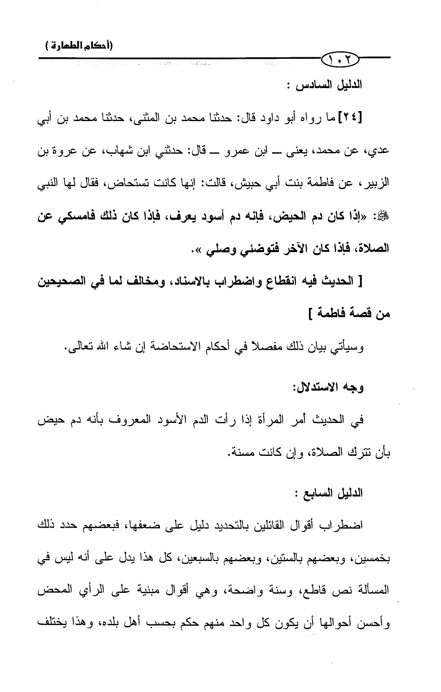 [٢٤] ما رواه أبو داود قال: حدثنا محمد بن المثنى، حدثنا محمد بن أبي عدي، عن محمد، يعنى - ابن عمرو - قال: حدثني ابن شهاب، عن عروة بن الزبير، عن فاطمة بنت أبي حبيش، قالت: إنها كانت تستحاض، فقال لها النبي - صلى الله عليه وسلم -: "إذا كان دم الحيض، فإنه دم أسود يعرف، فإذا كان ذلك فامسكي عن الصلاة، فإذا كان الآخر فتوضئي وصلي".