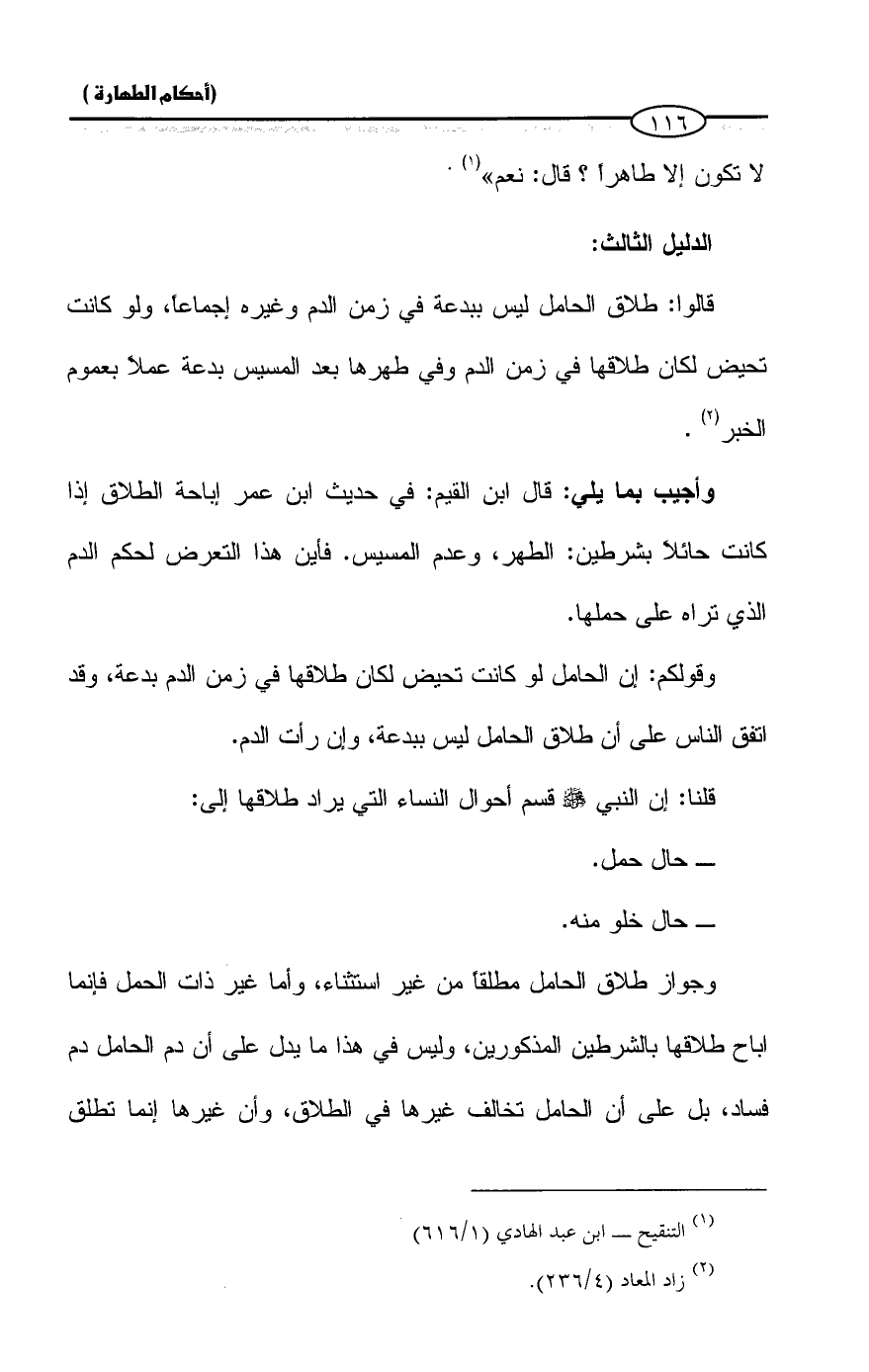 وجواز طلاق الحامل مطلقاً من غير استثناء، وأما غير ذات الحمل فإنما اباح طلاقها بالشرطين المذكورين، وليس في هذا ما يدل على أن دم الحامل دم فساد، بل على أن الحامل تخالف غيرها في الطلاق، وأن غيرها إنما تطلق