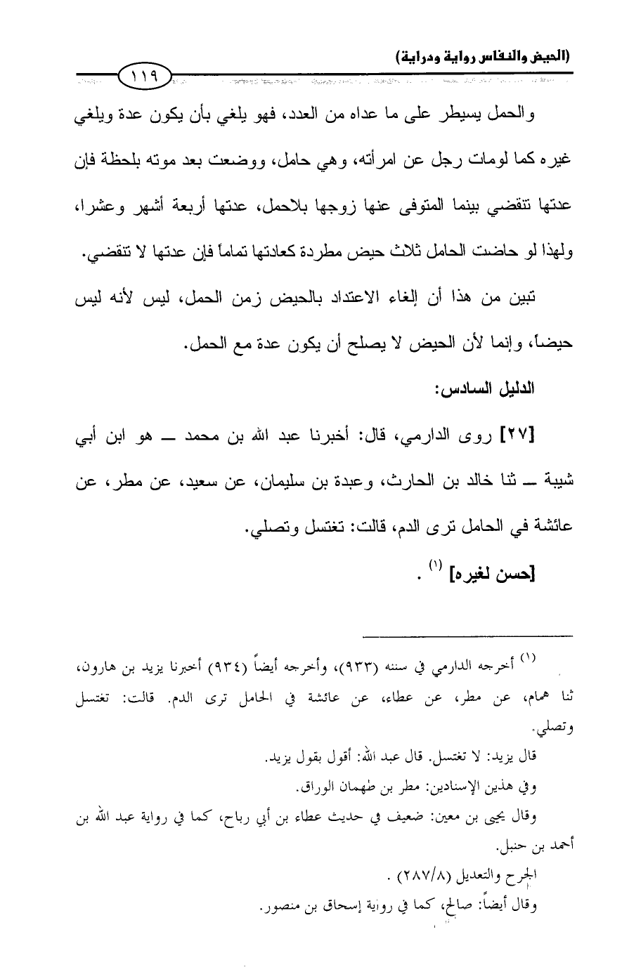[٢٧] روى الدارمي، قال: أخبرنا عبد الله بن محمد - هو ابن أبي شيبة - ثنا خالد بن الحارث، وعبدة بن سليمان، عن سعيد، عن مطر، عن عائشة في الحامل ترى الدم، قالت: تغتسل وتصلي.