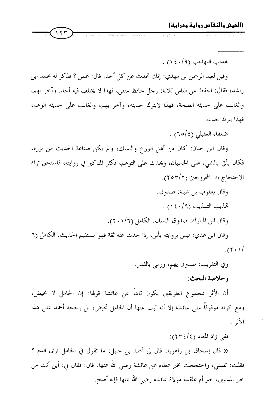 "قال إسحاق بن راهوية: قال لي أحمد بن حنبل: ما تقول في الحامل ترى الدم؟ فقلت: تصلي، واحتججت بخبر عطاء عن عائشة رضي الله عنها. قال: فقال لي: أين أنت من خبر المدنيين، خبر أم علقمة مولاة عائشة رضي الله عنها فإنه أصح.