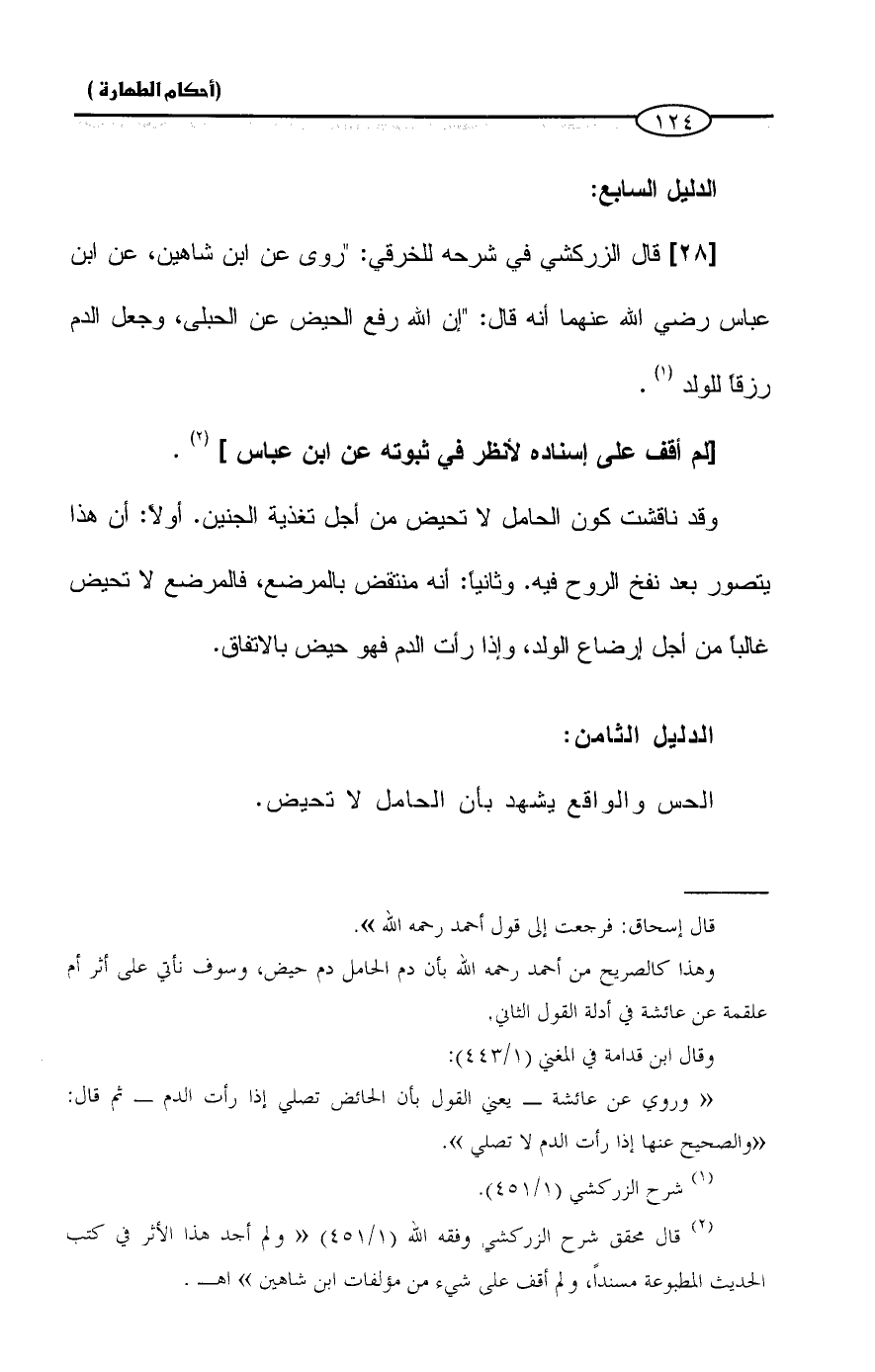 [٢٨] قال الزركشي في شرحه للخرقي: "روى عن ابن شاهين، عن ابن عباس رضي الله عنهما أنه قال: "إن الله رفع الحيض عن الحبلى، وجعل الدم رزقاً للولد (¬١).