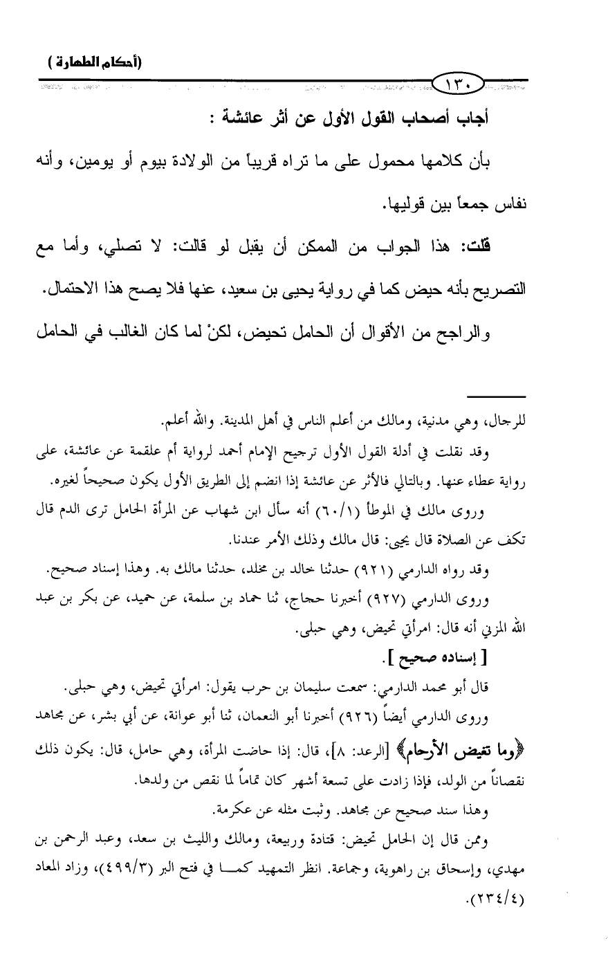 قال أَبو محمد الدارمي: سمعت سليمان بن حرب يقول: امرأتي تحيض، وهي حبلى.