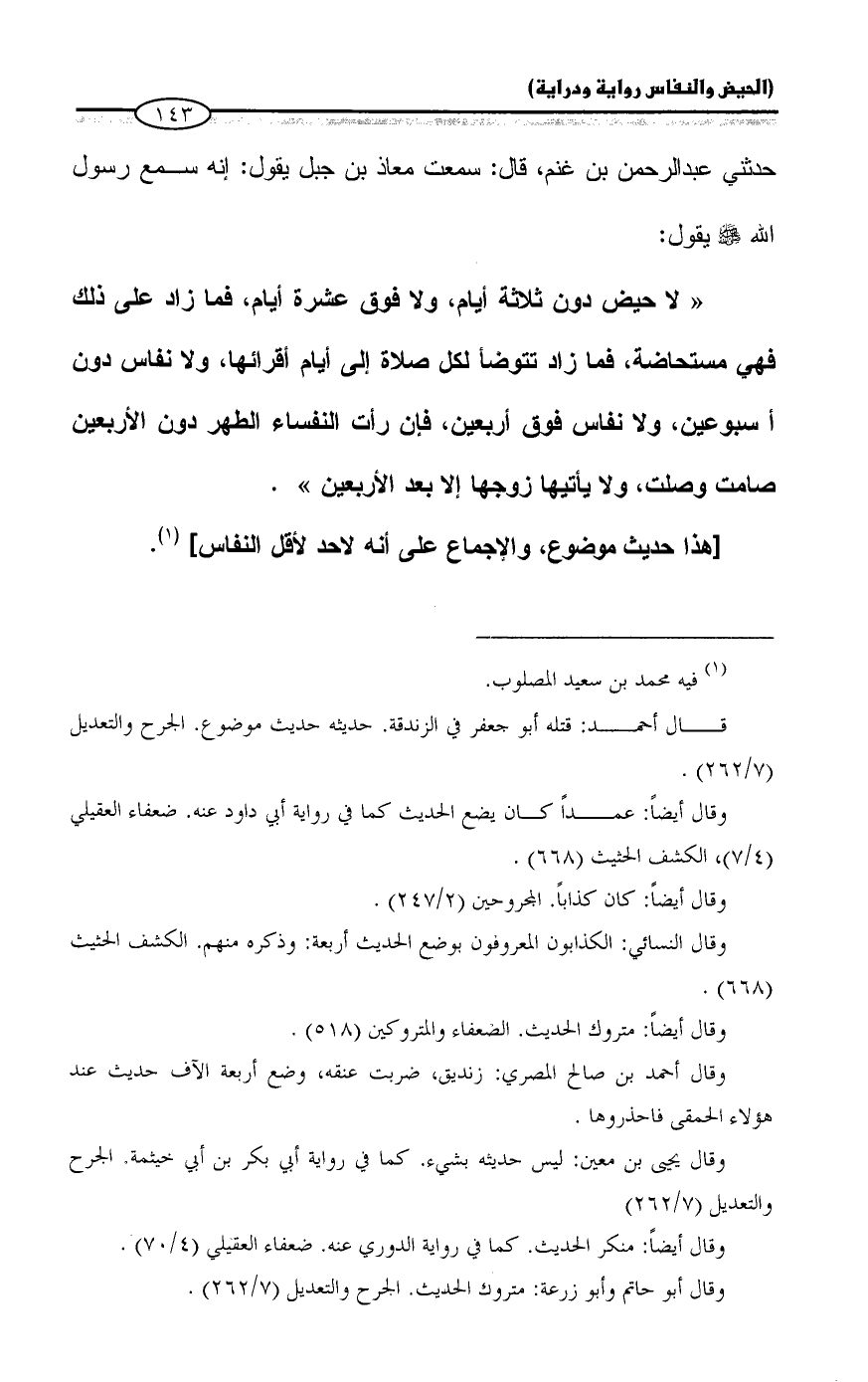 "لا حيض دون ثلاثة أيام، ولا فوق عشرة أيام، فما زاد على ذلك فهي مستحاضة، فما زاد تتوضأ لكل صلاة إلى أيام أقرائها، ولا نفاس دون أسبوعين، ولا نفاس فوق أربعين، فإن رأت النفساء الطهر دون الأربعين صامت وصلت، ولا يأتيها زوجها إلا بعد الأربعين".