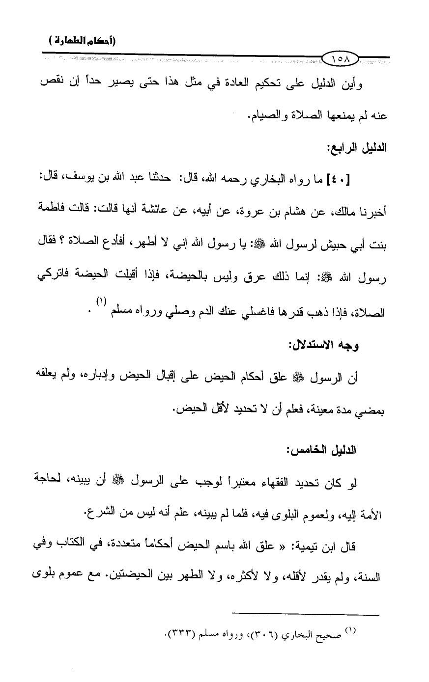 [٤٠] ما رواه البخاري رحمه الله، قال: حدثنا عبد الله بن يوسف، قال: أخبرنا مالك، عن هشام بن عروة، عن أبيه، عن عائشة أنها قالت: قالت فاطمة بنت أبي حبيش لرسول الله - صلى الله عليه وسلم -: يا رسول الله إني لا أطهر، أفأدع الصلاة؟ فقال رسول الله - صلى الله عليه وسلم -: إنما ذلك عرق وليس بالحيضة، فإذا أقبلت الحيضة فاتركي الصلاة، فإذا ذهب قدرها فاغسلي عنك الدم وصلي ورواه مسلم (¬١).