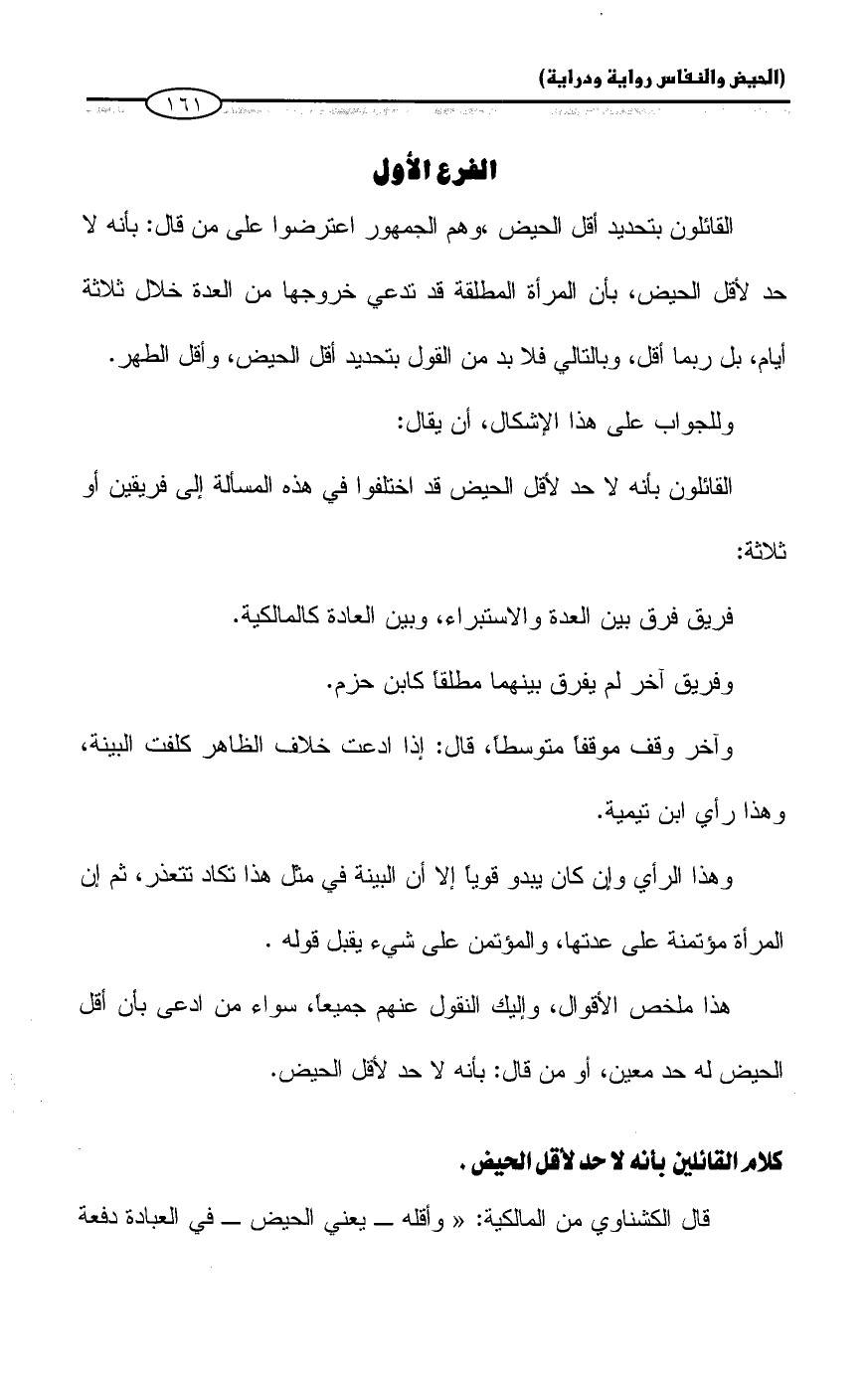 هذا ملخص الأقوال، وإليك النقول عنهم جميعاً، سواء من ادعى بأن أقل الحيض له حد معين، أو من قال: بأنه لا حد لأقل الحيض.