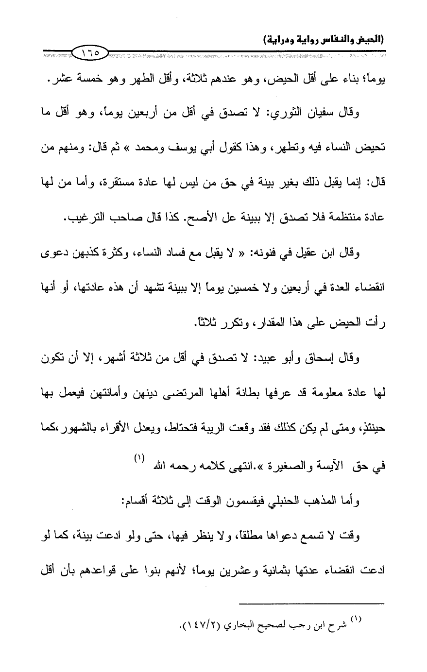 وقال ابن عقيل فى فنونه: "لا يقبل مع فساد النساء، وكثرة كذبهن دعوى انقضاء العدة فى أربعين ولا خمسين يوماً إلا ببينة تشهد أن هذه عادتها، أو أنها رأت الحيض على هذا المقدار، وتكرر ثلاثاً.