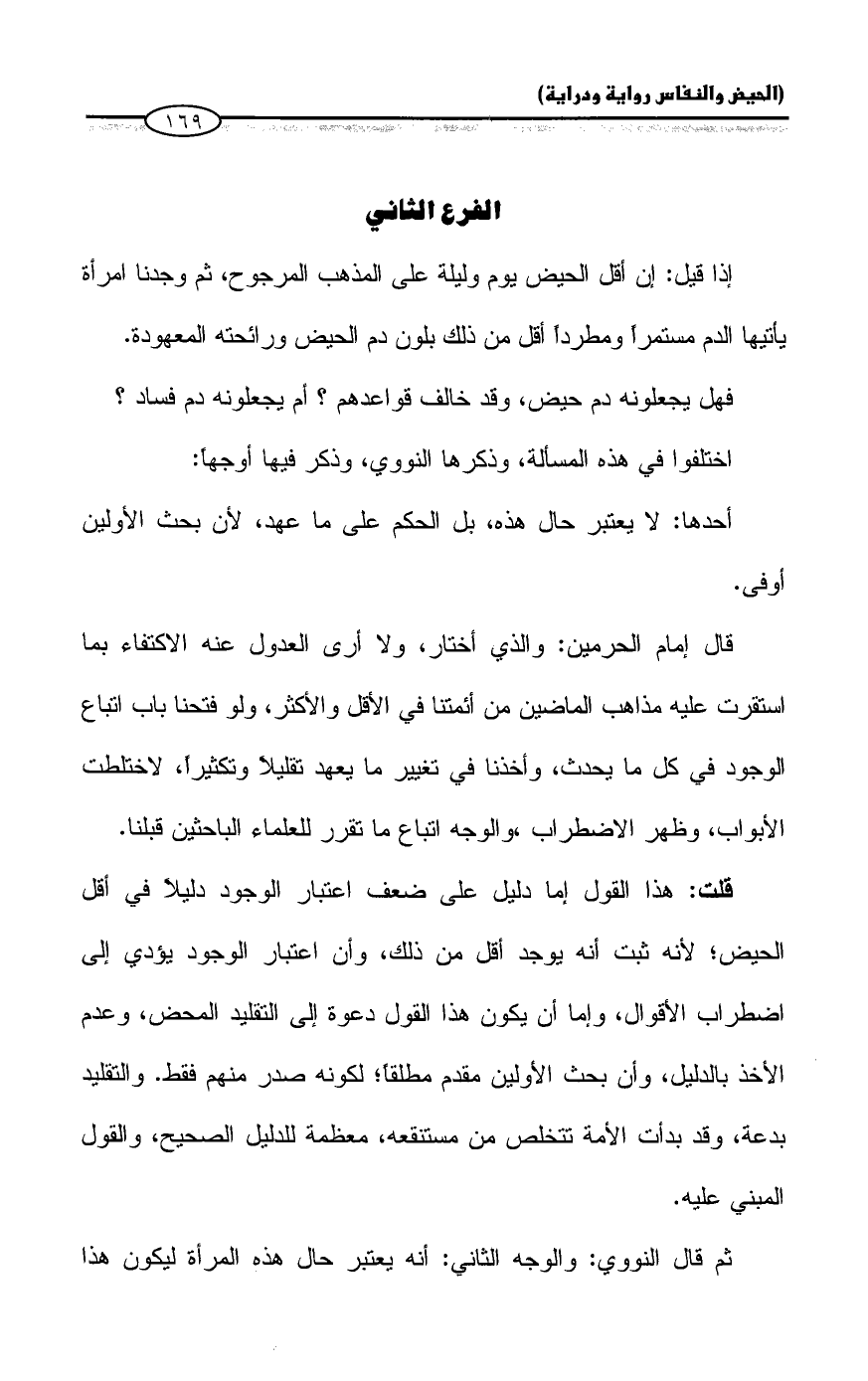 قلت: هذا القول إما دليل على ضعف اعتبار الوجود دليلاً في أقل الحيض؛ لأنه ثبت أنه يوجد أقل من ذلك، وأن اعتبار الوجود يؤدي إلى اضطراب الأقوال، وإما أن يكون هذا القول دعوة إلى التقليد المحض، وعدم الأخذ بالدليل، وأن بحث الأولين مقدم مطلقاً؛ لكونه صدر منهم فقط. والتقليد بدعة، وقد بدأت الأمة تتخلص من مستنقعه، معظمة للدليل الصحيح، والقول المبني عليه.