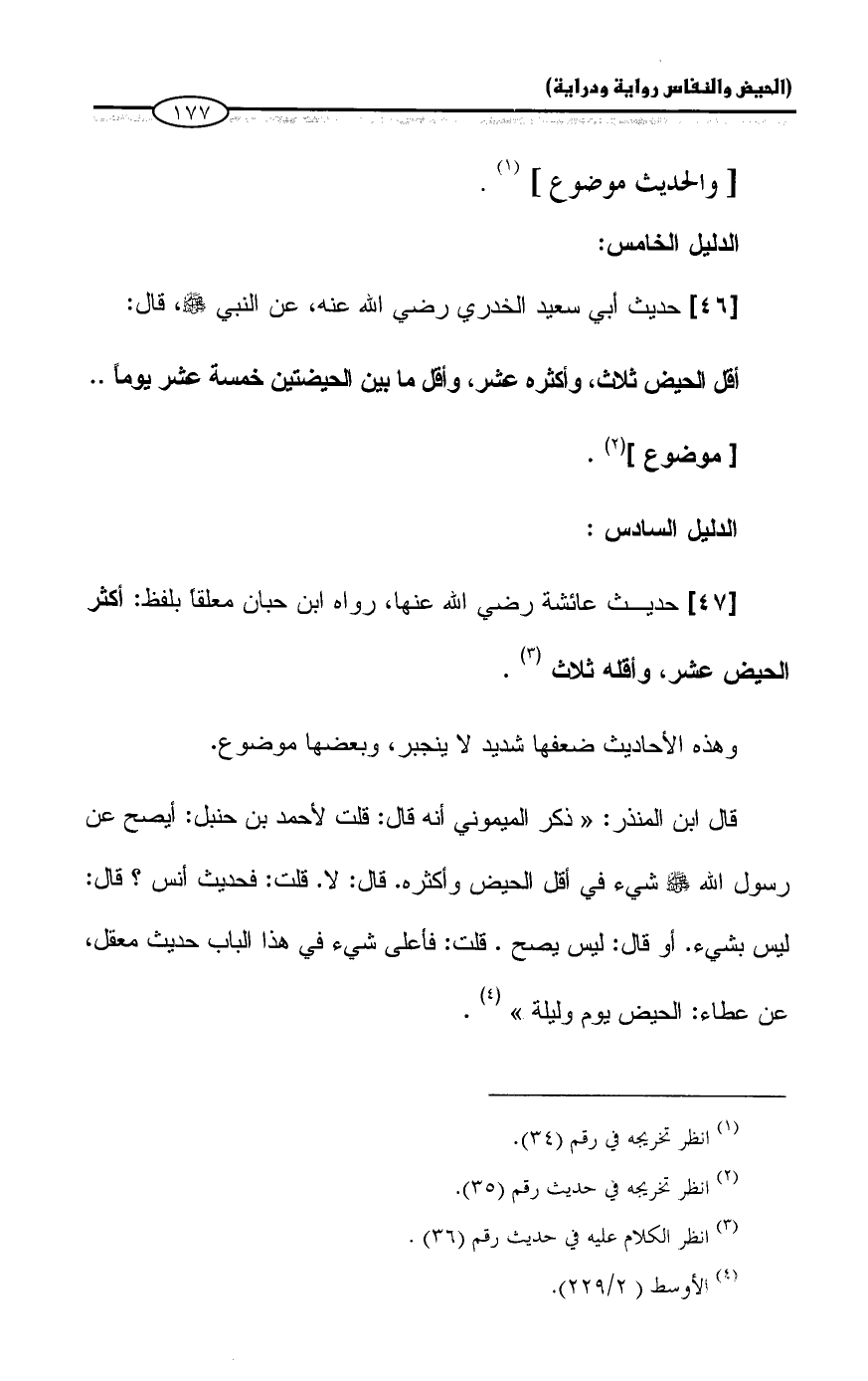 [٤٦] حديث أبي سعيد الخدري رضي الله عنه، عن النبي - صلى الله عليه وسلم -، قال: أقل الحيض ثلاث، وأكثره عشر، وأقل ما بين الحيضتين خمسة عشر يوماً ..
