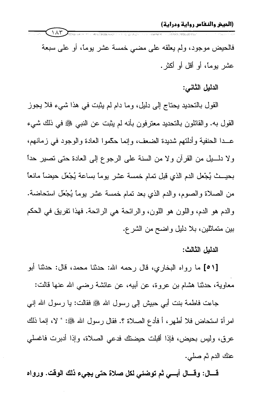 القول بالتحديد يحتاج إلى دليل، وما دام لم يثبت في هذا شيء فلا يجوز القول به. والقائلون بالتحديد معترفون بأنه لم يثبت عن النبي - صلى الله عليه وسلم - في ذلك شيء عدا الحنفية وأدلتهم شديدة الضعف، وإنما حكموا العادة والوجود في زمانهم، ولا دليل من القرآن ولا من السنة على الرجوع إلى العادة حتى تصير حداً بحيث يُجْعل الدم الذي قبل تمام خمسة عشر يوماً بساعة يُجْعَل حيضاً مانعاً من الصلاة والصوم، والدم الذى بعد تمام خمسة عشر يوماً يُجْعَل استحاضة. والدم هو الدم، واللون هو اللون، والرائحة هي الرائحة. فهذا تفريق في الحكم بين متماثلين، بلا دليل واضح من الشرع.
