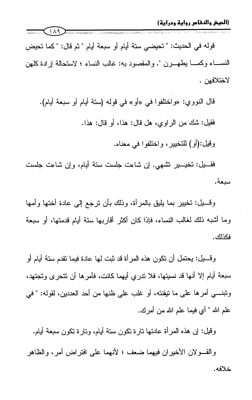 قوله في الحديث: "تحيضي ستة أيام أو سبعة أيام" ثم قال: "كما تحيض النساء وكما يطهرن". والمقصود به: غالب النساء؛ لاستحالة إرادة كلهن لاختلافهن.