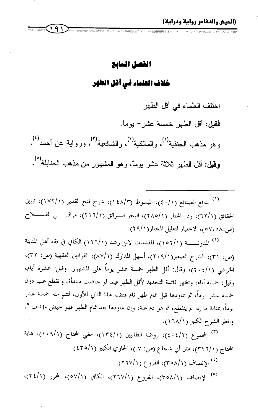 الفصل السابع: خلاف العلماء في أقل الطهر