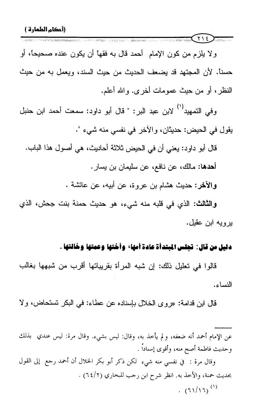 وقال مرة: في نفسي منه شيء لكن ذكر أبو بكر الخلال أن أحمد رجع إلى القول بحديث حمنة، والأخذ به. انظر شرح ابن رجب للبخاري (٢/ ٦٤).