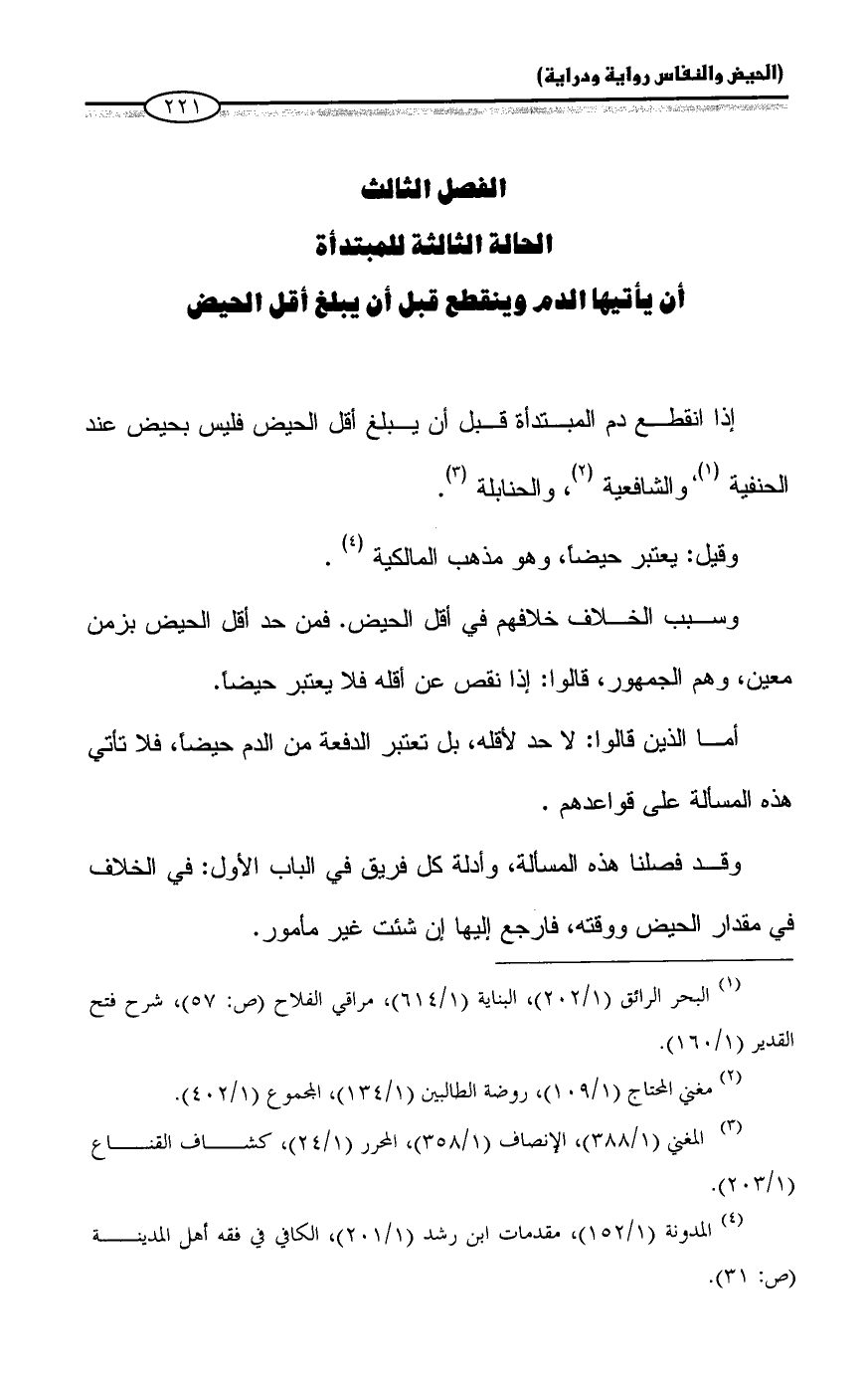 الفصل الثالث: الحالة الثالثة للمبتدأة أن يأتيها الدم وينقطع قبل أن يبلغ أقل الحيض