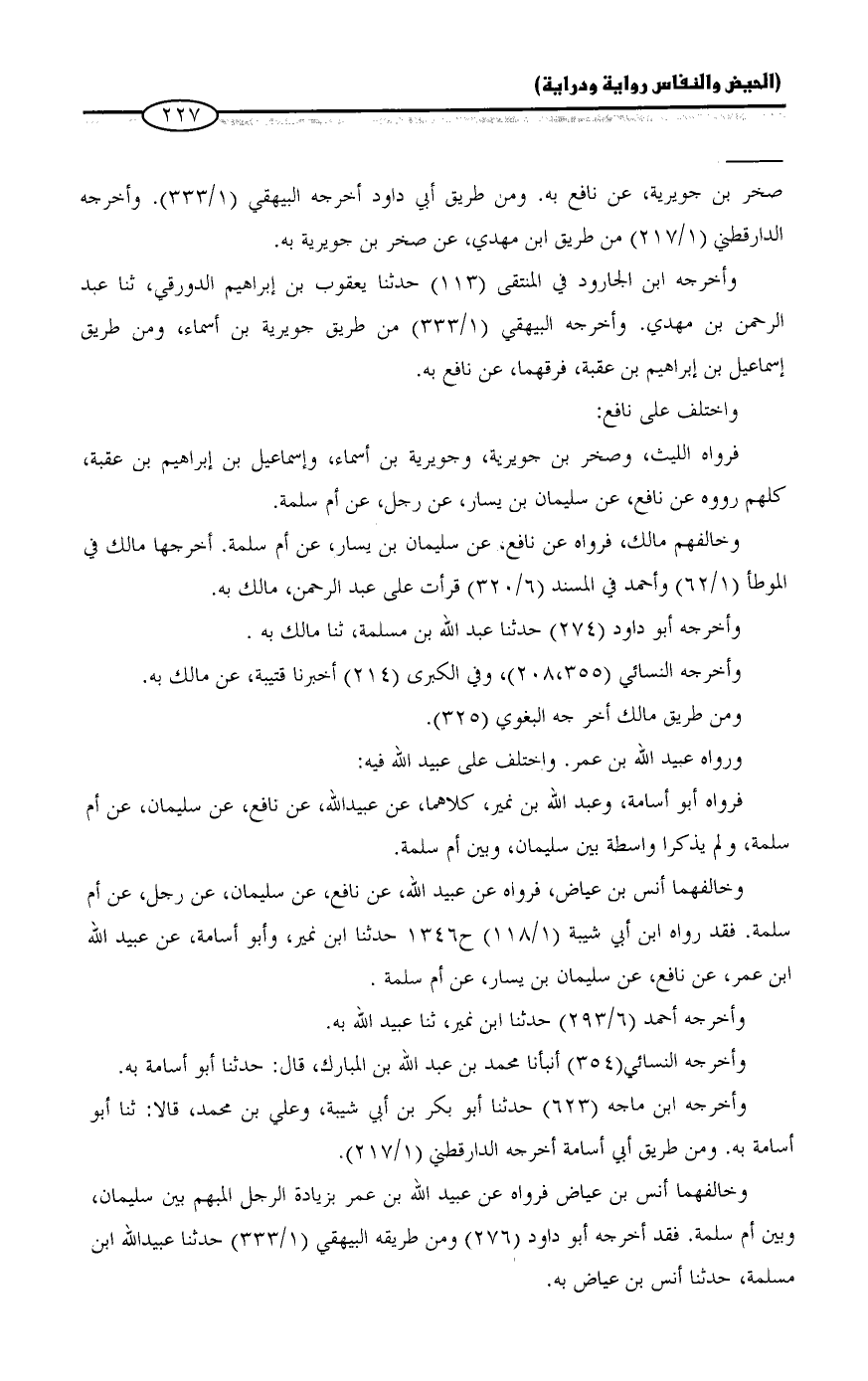 وخالفهما أنس بن عياض، فرواه عن عبيد الله، عن نافع، عن سليمان، عن رجل، عن أم سلمة. فقد رواه ابن أبي شيبة (١/ ١١٨) ح ١٣٤٦ حدثنا ابن نمير، وأبو أسامة، عن عبيد الله ابن عمر، عن نافع، عن سليمان بن يسار، عن أم سلمة.