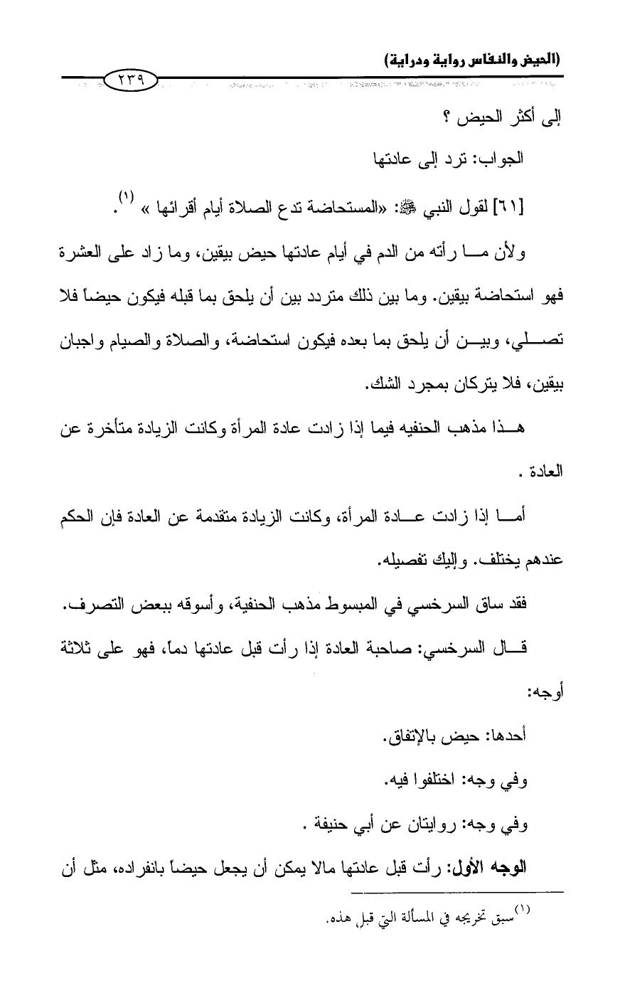 [٦١] لقول النبي - صلى الله عليه وسلم -: "المستحاضة تدع الصلاة أيام أقرائها" (¬١).