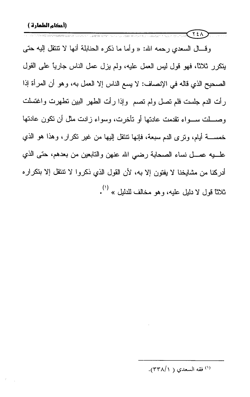 وقال السعدي رحمه الله: "وأما ما ذكره الحنابلة أنها لا تنتقل إليه حتى يتكرر ثلاثاً، فهو قول ليس العمل عليه، ولم يزل عمل الناس جارياً على القول الصحيح الذي قاله في الإنصاف: لا يسع الناس إلا العمل به، وهو أن المرأة إذا رأت الدم جلست فلم تصل ولم تصم وإذا رأيت الطهر البين تطهرت واغتسلت وصلت سواء تقدمت عادتها أو تأخرت، وسواء زادت مثل أن تكون عادتها خمسة أيام، وترى الدم سبعة، فإنها تنتقل إليها من غير تكرار، وهذا هو الذي عليه عمل نساء الصحابة رضي الله عنهن والتابعين من بعدهم، حتى الذي أدركنا من مشايخنا لا يفتون إلا به، لأن القول الذي ذكروا لا تنتقل إلا بتكراره ثلاثاً قول لا دليل عليه، وهو مخالف للدليل" (¬١).