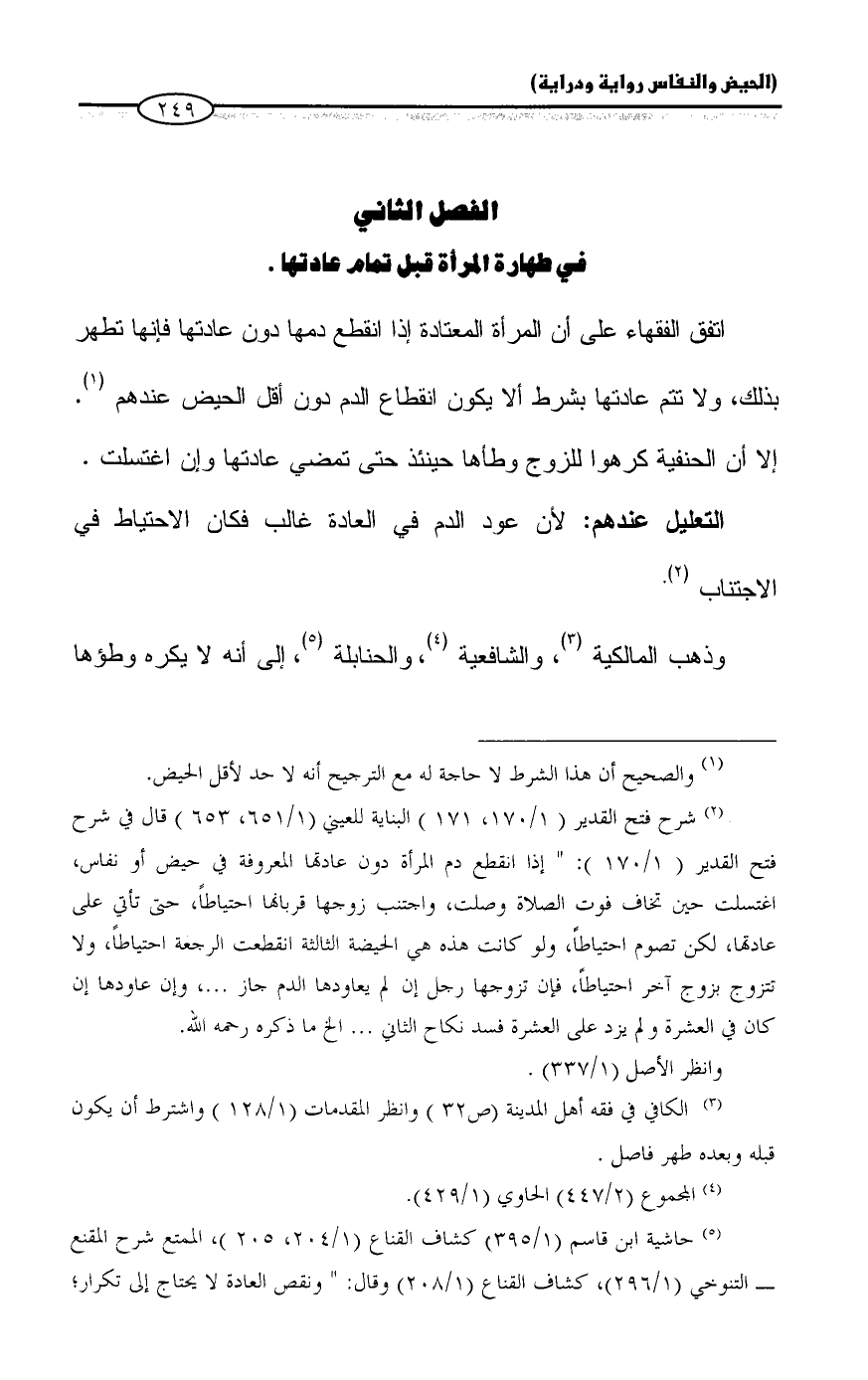 (¬٢) شرح فتح القدير (١/ ١٧٠، ١٧١) البناية للعيني (١/ ٦٥١، ٦٥٣) قال في شرح فتح القدير (١/ ١٧٠): "إذا انقطع دم المرأة دون عادتها المعروفة في حيض أو نفاس، اغتسلت حين تخاف فوت الصلاة وصلت، واجتنب زوجها قربانها احتياطاً، حتى تأتي على عادتها، لكن تصوم احتياطاً، ولو كانت هذه هي الحيضة الثالثة انقطعت الرجعة احتياطاً، ولا تتزوج بزوج آخر احتياطاً، فإذ تزوجها رجل إن لم يعاودها الدم جاز ... ، وإن عاودها إن كان في العشرة ولم يزد على العشرة فسد نكاح الثاني ... إلخ ما ذكره رحمه الله.