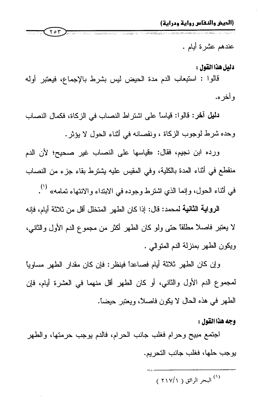 ورده ابن نجيم، فقال: "قياسها على النصاب غير صحيح؛ لأن الدم منقطع في أثناء المدة بالكلية، وفي المقيس عليه يشترط بقاء جزء من النصاب في أثناء الحول، وإنما الذى اشترط وجوده في الابتداء والانتهاء تمامه" (¬١).