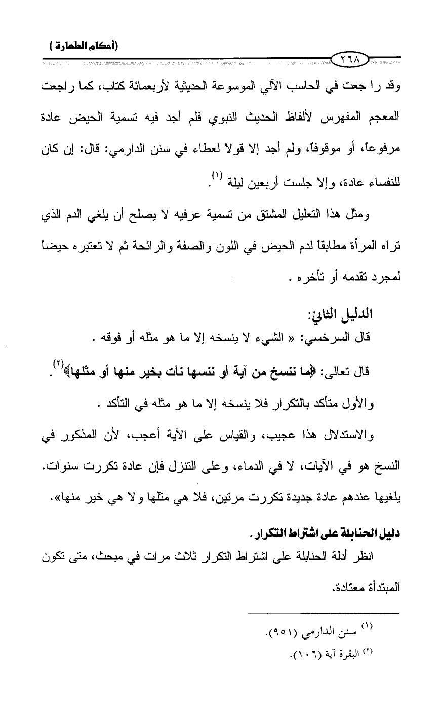 وقد راجعت في الحاسب الآلي الموسوعة الحديثية لأربعمائة كتاب، كما راجعت المعجم المفهرس لألفاظ الحديث النبوى فلم أجد فيه تسمية الحيض عادة مرفوعاً، أو موقوفاً، ولم أجد إلا قولاً لعطاء في سنن الدارمي: قال: إن كان للنفساء عادة، وإلا جلست أربعين ليلة (¬١).