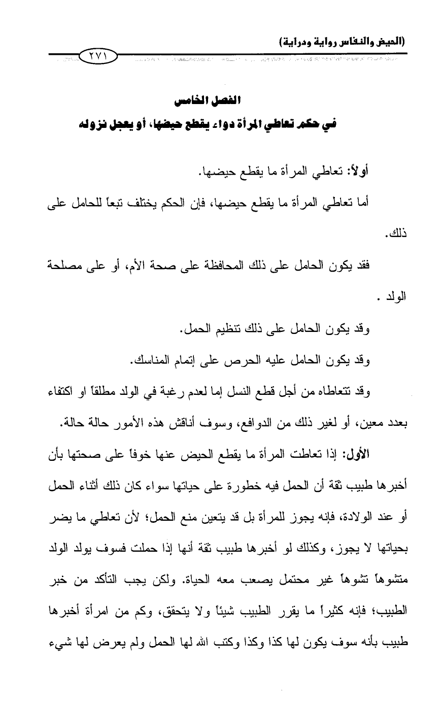 الفصل الخامس: في حكم تعاطي المرأة دواء يقطع حيضها، أو يعجل نزوله