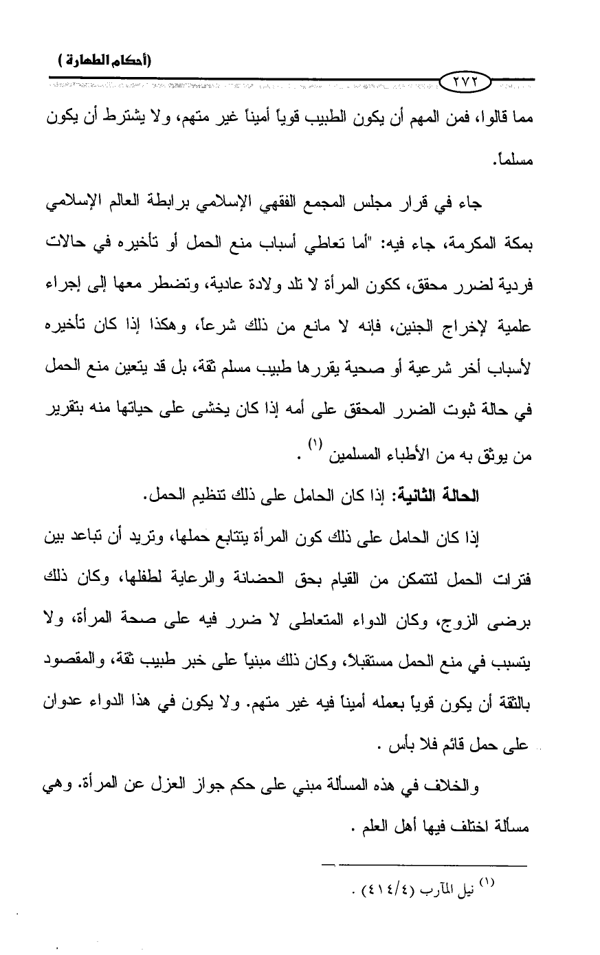 جاء في قرار مجلس المجمع الفقهي الإسلامي برابطة العالم الإسلامي بمكة المكرمة، جاء فيه: "أما تعاطي أسباب منع الحمل أو تأخيره في حالات فردية لضرر محقق، ككون المرأة لا تلد ولادة عادية، وتضطر معها إلى إجراء عملية لإخراج الجنين، فإنه لا مانع من ذلك شرعاً، وهكذا إذا كان تأخيره لأسباب أخر شرعية أو صحية يقررها طبيب مسلم ثقة، بل قد يتعين منع الحمل في حالة ثبوت الضرر المحقق على أمه إذا كان يخشى على حياتها منه بتقرير من يوثق به من الأطباء المسلمين (¬١).