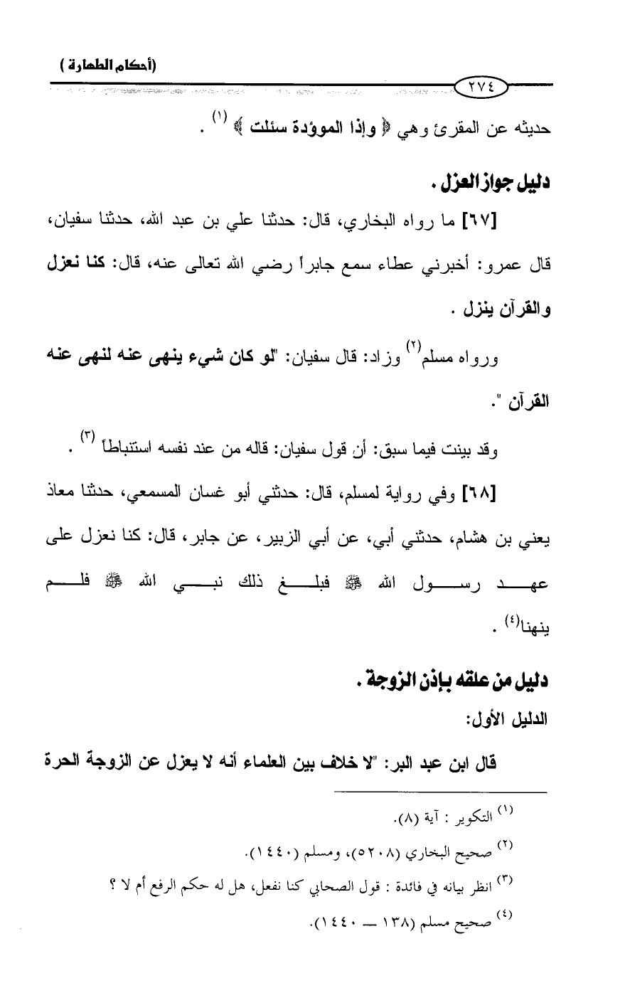 [٦٧] ما رواه البخاري، قال: حدثنا علي بن عبد الله، حدثنا سفيان، قال عمرو: أخبرني عطاء سمع جابراً رضي الله تعالى عنه، قال: كنا نعزل والقرآن ينزل.