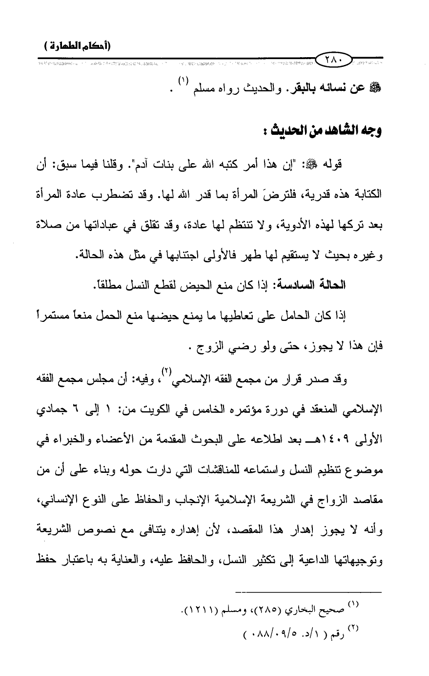 وقد صدر قرار من مجمع الفقه الإسلامي (¬٢)، وفيه: أن مجلس مجمع الفقه الإسلامي المنعقد فى دورة مؤتمره الخامس في الكويت من: ١ إلى ٦ جمادي الأولى ١٤٠٩ هـ بعد اطلاعه على البحوث المقدمة من الأعضاء والخبراء في موضوع تنظيم النسل واستماعه للمناقشات التي دارت حوله وبناء على أن من مقاصد الزواج في الشريعة الإسلامية الإنجاب والحفاظ على النوع الإنساني، وأنه لا يجوز إهدار هذا المقصد، لأن إهداره يتنافى مع نصوص الشريعة وتوجيهاتها الداعية إلى تكثير النسل، والحافظ عليه، والعناية به باعتبار حفظ