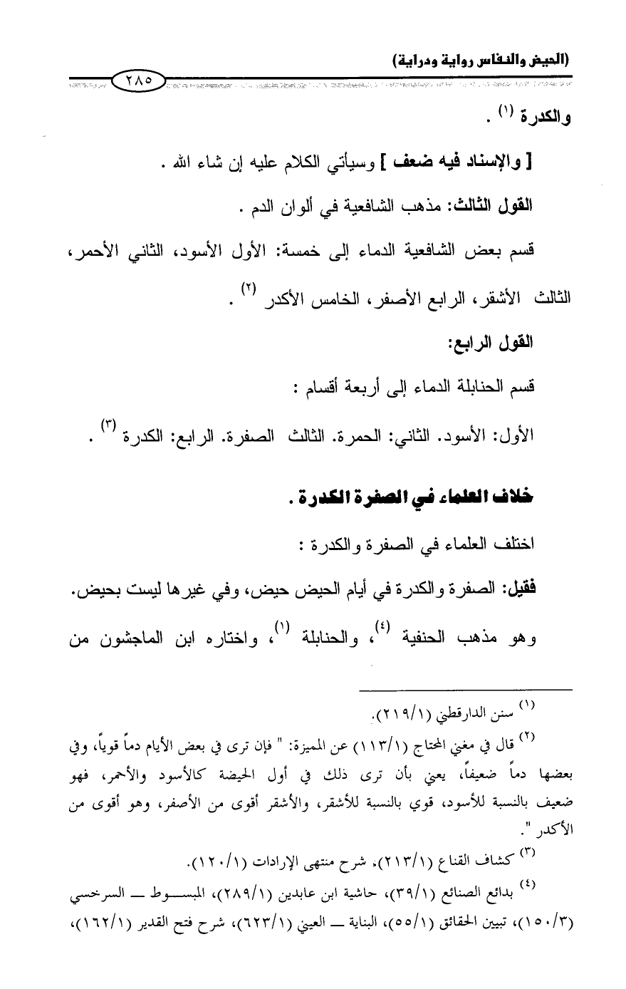 الأول: الأسود. الثاني: الحمرة. الثالث الصفرة. الرابع: الكدرة (¬٣).