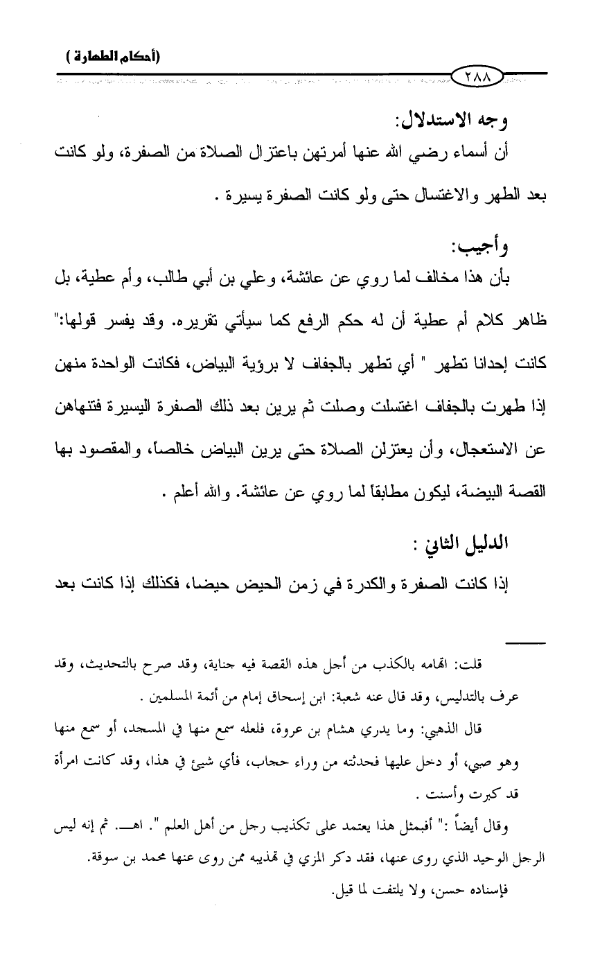 بأن هذا مخالف لما روي عن عائشة، وعلي بن أبي طالب، وأم عطية، بل ظاهر كلام أم عطية أن له حكم الرفع كما سيأتي تقريره. وقد يفسر قولها: "كانت إحدانا تطهر" أى تطهر بالجفاف لا برؤية البياض، فكانت الواحدة منهن إذا طهرت بالجفاف اغتسلت وصلت ثم يرين بعد ذلك الصفرة اليسيرة فتنهاهن عن الاستعجال، وأن يعتزلن الصلاة حتى يرين البياض خالصاً، والمقصود بها القصة البيضة، ليكون مطابقاً لما روى عن عائشة. والله أعلم.