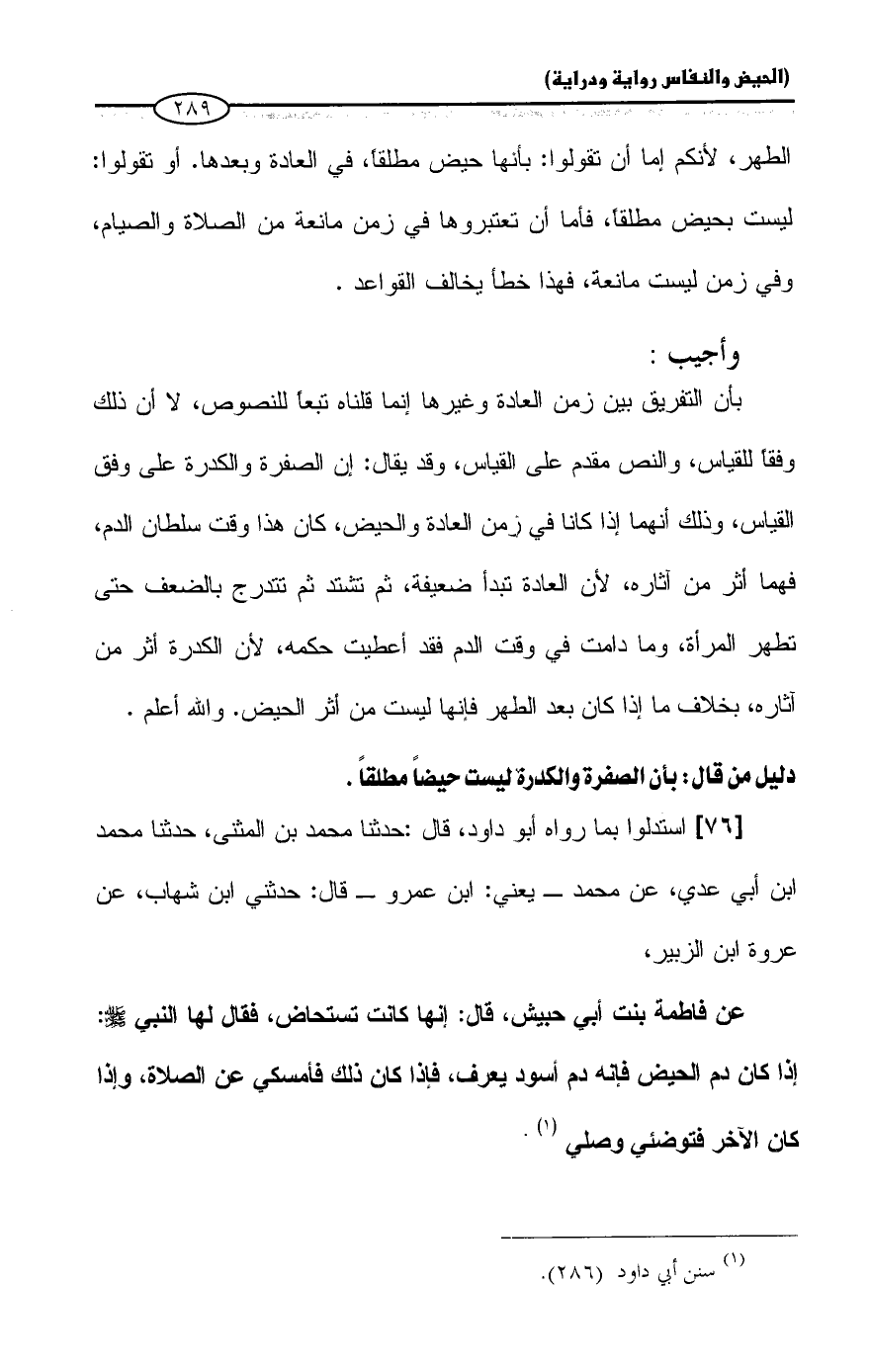 الطهر، لأنكم إما أن تقولوا: بأنها حيض مطلقاً، في العادة وبعدها. أو تقولوا: ليست بحيض مطلقاً، فأما أن تعتبروها في زمن مانعة من الصلاة والصيام، وفي زمن ليست مانعة، فهذا خطأ يخالف القواعد.