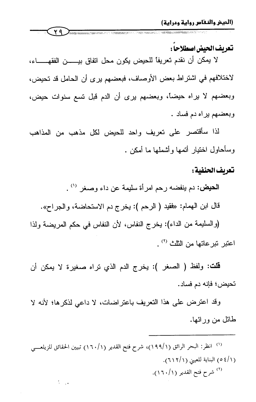 لا يمكن أن نقدم تعريفاً للحيض يكون محل اتفاق بين الفقهاء، لاختلافهم فى اشتراط بعض الأوصاف، فبعضهم يرى أن الحامل قد تحيض، وبعضهم لا يراه حيضاً، وبعضهم يرى أن الدم قبل تسع سنوات حيض، وبعضهم يراه دم فساد.
