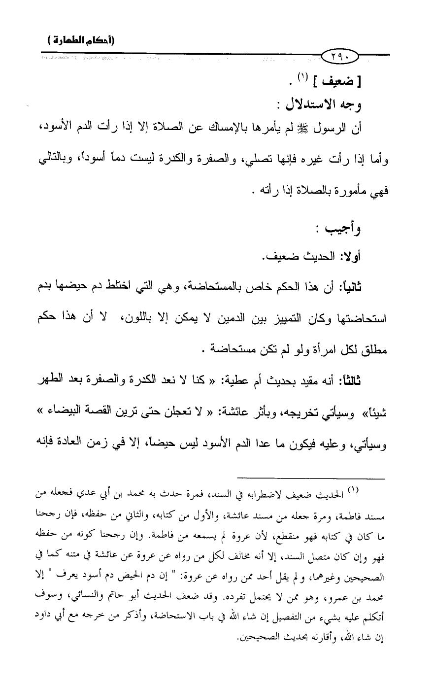 (¬١) الحديث ضعيف لاضطرابه في السند، فمرة حدث به محمد بن أبي عدي فجعله من مسند فاطمة، ومرة جعله من مسند عائشة، والأول من كتابه، والثاني من حفظه، فإن رجحنا ما كان في كتابه فهو منقطع، لأن عروة لم يسمعه من فاطمة. وإن رجحنا كونه من حفظه فهو وإن كان متصل السند، إلا أنه مخالف لكل من رواه عن عروة عن عائشة في متنه كما في الصحيحين وغيرهما، ولم يقل أحد ممن رواه عن عروة: "إن دم الحيض دم أسود يعرف" إلا محمد بن عمرو، وهو ممن لا يحتمل تفرده. وقد ضعف الحديث أبو حاتم والنسائي، وسوف أتكلم عليه بشيء من التفصيل إن شاء الله في باب الاستحاضة، وأذكر من خرجه مع أبي داود إن شاء الله، وأقارنه بحديث الصحيحين.