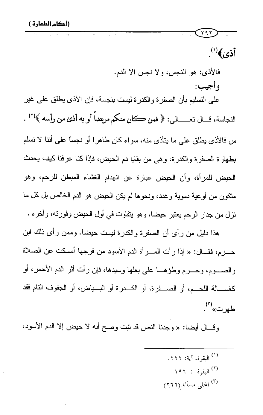 على التسليم بأن الصفرة والكدرة ليست بنجسة، فإن الأذى يطلق على غير النجاسة، قال تعالى: {فَمَنْ كَانَ مِنْكُمْ مَرِيضًا أَوْ بِهِ أَذًى مِنْ رَأْسِهِ} (¬٢). س فالأذى يطلق على ما يتأذى منه، سواء كان طاهراً أو نجساً على أننا لا نسلم بطهارة الصفرة والكدرة، وهي من بقايا دم الحيض، فإذا كنا عرفنا كيف يحدث الحيض للمرأة، وأن الحيض عبارة عن انهدام الغشاء المبطن للرحم، وهو متكون من أوعية دموية وغدد، ونحوها لم يكن الحيض هو الدم الخالص بل كل ما نزل من جدار الرحم يعتبر حيضاً، وهو يتفاوت في أول الحيض وفورته، وآخره.