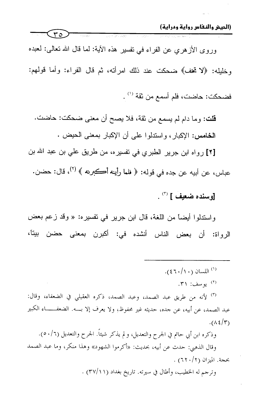 [٢] رواه ابن جرير الطبري في تفسيره، من طريق علي بن عبد الله بن عباس، عن أبيه عن جده في قوله: {فَلَمَّا رَأَيْنَهُ أَكْبَرْنَهُ} (¬٢)، قال: حضن.
