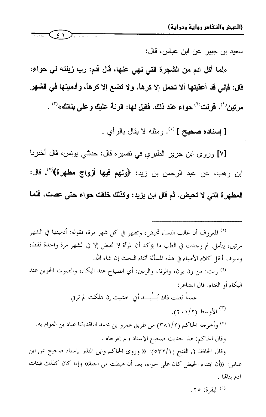 وقال الحافظ في الفتح (١/ ٥٣٢): "وروى الحاكم وابن المنذر بإسناد صحيح عن ابن عباس: "أن ابتداء الحيض كان على حواء، بعد أن هبطت من الجنة" وإذا كان كذلك فبنات آدم بناتها.