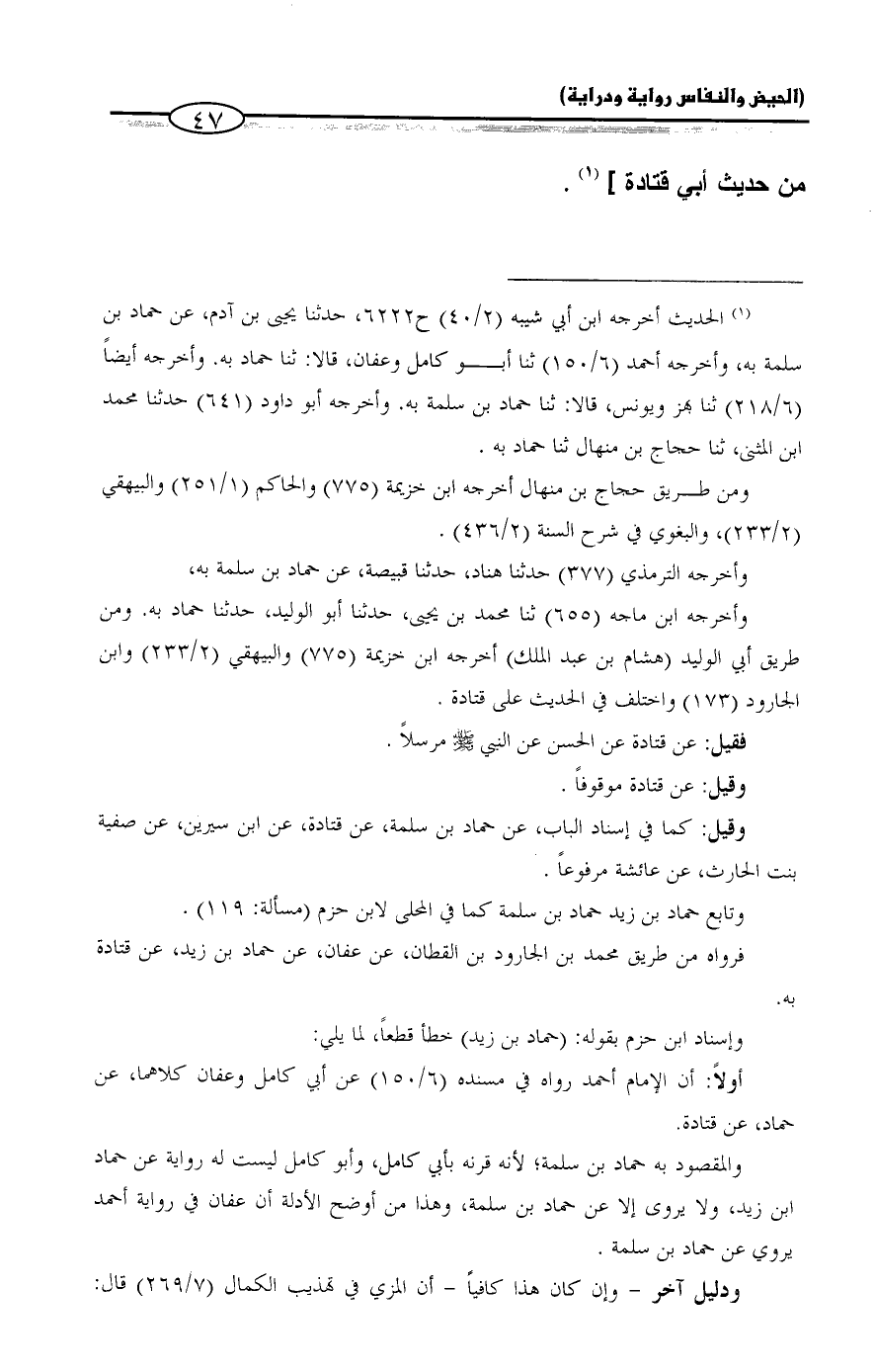 (¬١) الحديث أخرجه ابن أبي شيبه (٢/ ٤٠) ح ٦٢٢٢، حدثنا يحيى بن آدم، عن حماد بن سلمة به، وأخرجه أحمد (٦/ ١٥٠) ثنا أبو كامل وعفان، قالا: ثنا حماد به. وأخرجه أيضاً (٦/ ٢١٨) ثنا بهز ويونس، قالا: ثنا حماد بن سلمة به. وأخرجه أبو داود (٦٤١) حدثنا محمد ابن المثنى، ثنا حجاج بن منهال ثنا حماد به.