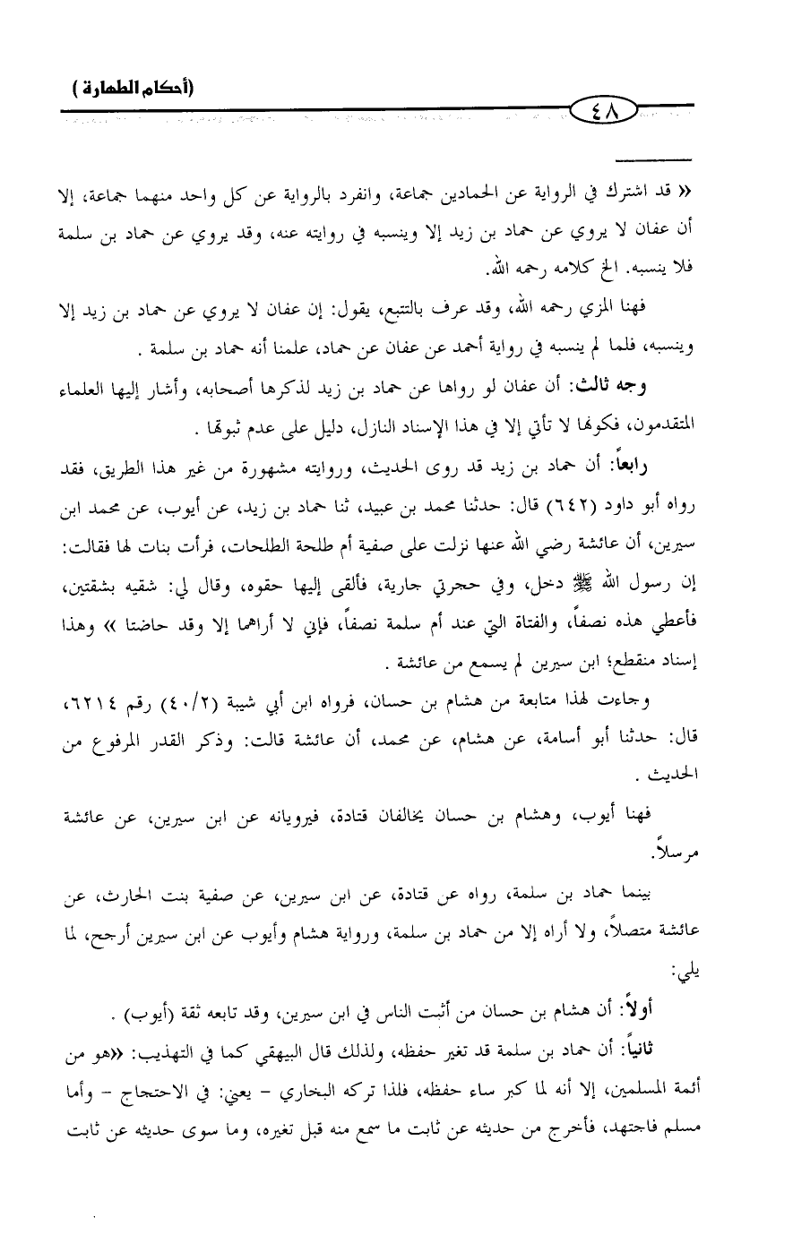 رابعاً: أن حماد بن زيد قد روى الحديث، وروايته مشهورة من غير هذا الطريق، فقد رواه أبو داود (٦٤٢) قال: حدثنا محمد بن عبيد، ثنا حماد بن زيد، عن أيوب، عن محمد ابن سيرين، أن عائشة رضي الله عنها نزلت على صفية أم طلحة الطلحات، فرأت بنات لها فقالت: إن رسول الله - صلى الله عليه وسلم - دخل، وفي حجرتي جارية، فألقى إليها حقوه، وقال لي: شقيه بشقتين، فأعطي هذه نصفاً، والفتاة التي عند أم سلمة نصفاً، فإني لا أراهما إلا وقد حاضتا" وهذا إسناد منقطع؛ ابن سيرين لم يسمع من عائشة.