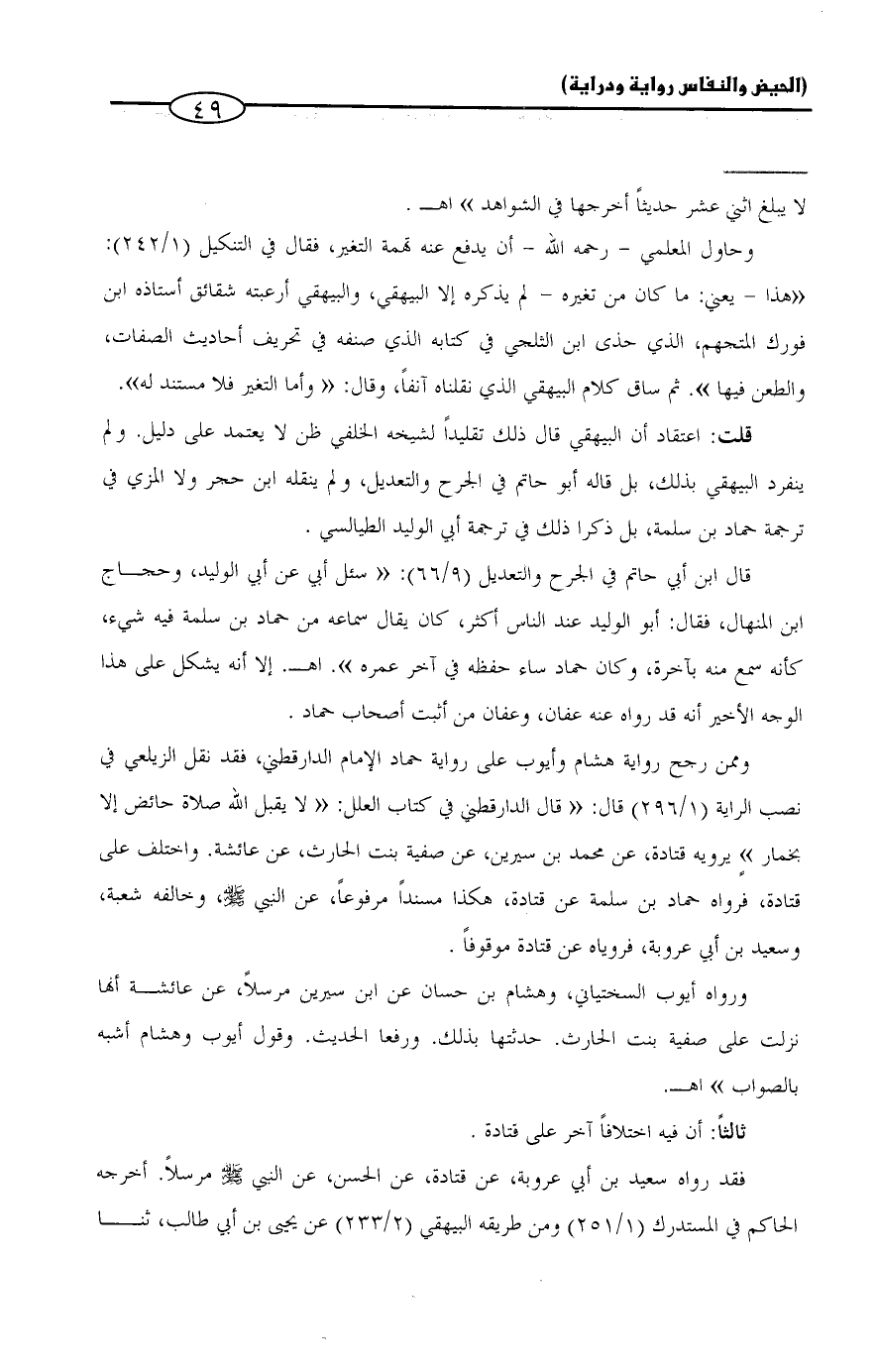 وممن رجح رواية هشام وأيوب على رواية حماد الإمام الدارقطني، فقد نقل الزيلعي في نصب الراية (١/ ٢٩٦) قال: "قال الدارقطني في كتاب العلل: "لا يقبل الله صلاة حائض إلا بخمار" يرويه قتادة، عن محمد بن سيرين، عن صفية بنت الحارث، عن عائشة. واختلف على قتادة، فرواه حماد بن سلمة عن قتادة، هكذا مسنداً مرفوعاً، عن النبي - صلى الله عليه وسلم -، وخالفه شعبة، وسعيد بن أبي عروبة، فروياه عن قتادة موقوفاً.