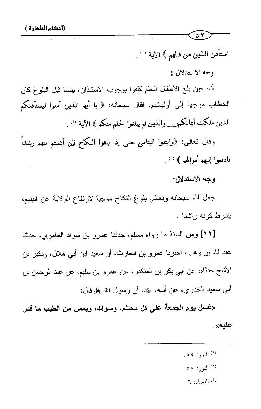 أنه حين بلغ الأطفال الحلم كلفوا بوجوب الاستئذان، بينما قبل البلوغ كان الخطاب موجهاً إلى أوليائهم. فقال سبحانه: {يَاأَيُّهَا الَّذِينَ آمَنُوا لِيَسْتَأْذِنْكُمُ الَّذِينَ مَلَكَتْ أَيْمَانُكُمْ وَالَّذِينَ لَمْ يَبْلُغُوا الْحُلُمَ مِنْكُم} الآية (¬٢).