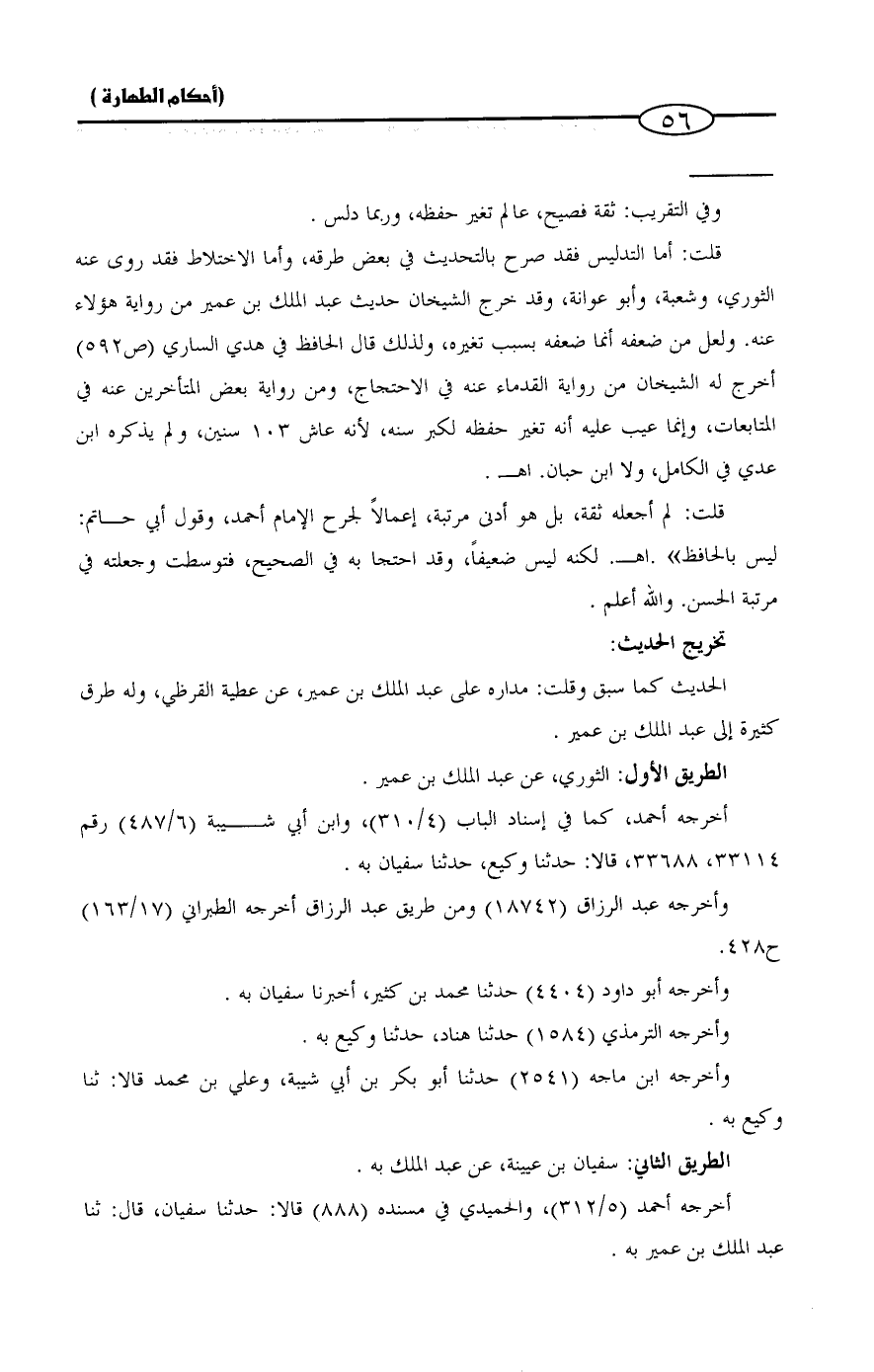 قلت: أما التدليس فقد صرح بالتحديث في بعض طرقه، وأما الاختلاط فقد روى عنه الثوري، وشعبة، وأبو عوانة، وقد خرج الشيخان حديث عبد الملك بن عمير من رواية هؤلاء عنه. ولعل من ضعفه أنما ضعفه بسبب تغيره، ولذلك قال الحافظ في هدي الساري (ص ٥٩٢) أخرج له الشيخان من رواية القدماء عنه في الاحتجاج، ومن رواية بعض المتأخرين عنه في المتابعات، وإنما عيب عليه أنه تغير حفظه لكبر سنه, لأنه عاش ١٠٣ سنين، ولم يذكره ابن عدي في الكامل، ولا ابن حبان. اهـ.